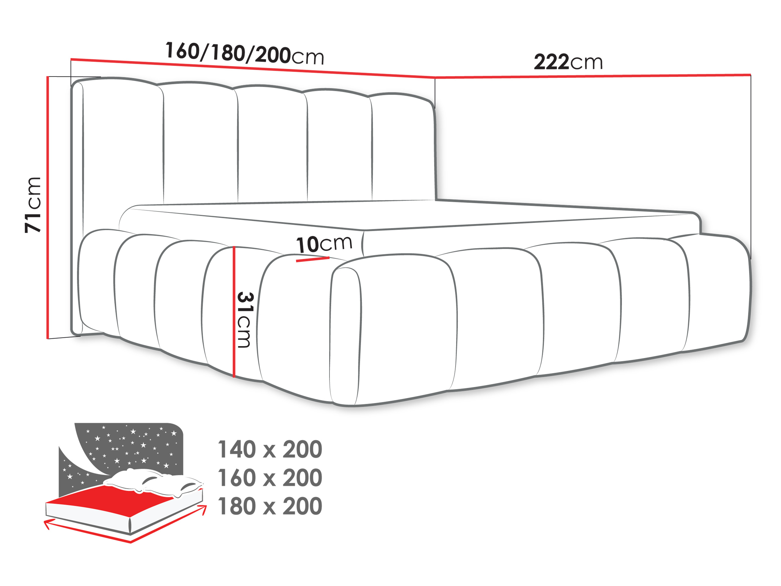 dĺžka: 222 cm, šírka: 160 cm, výška: 71 cm, plocha na spanie: 200 x 140 cm,