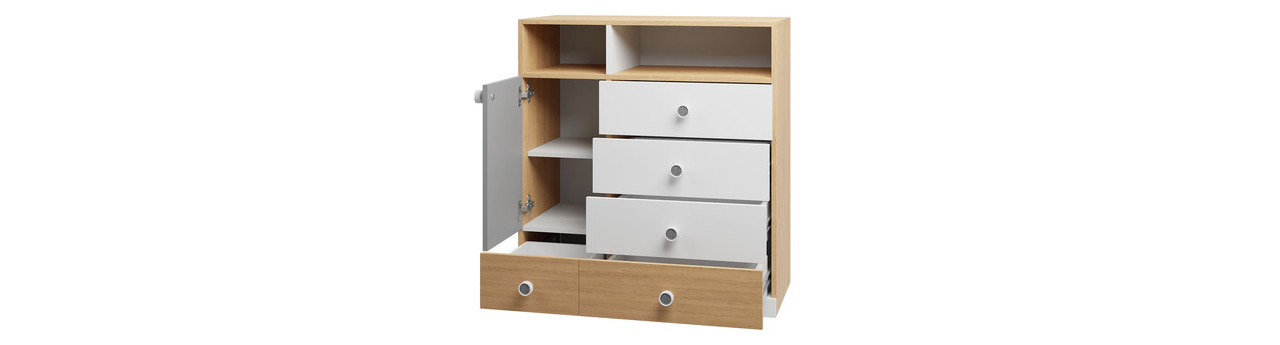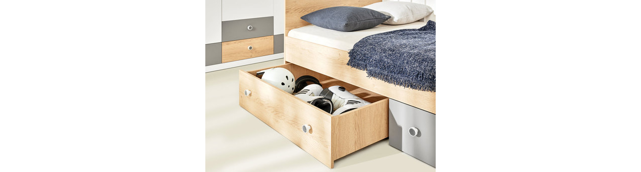 - univerzálna posteľ - pri montáži si zákazník určí, z ktorej strany sa budú zásuvky vysúvať - zásuvky sú vŕtané zvnútra (otvory pre madlo), zákazník musí vyvŕtať otvory pre správnu stranu,
