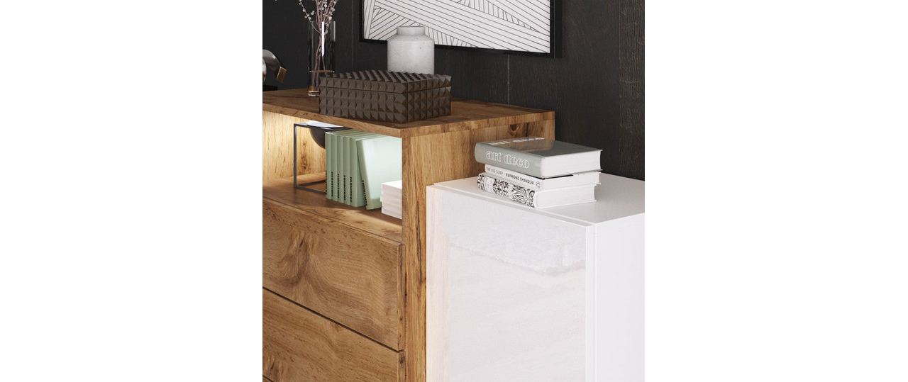 Umiestnením modernej komody Layla II môžete zdôrazniť jedinečný charakter svojej obývacej izby. Kombinácia najmodernejších farieb oživí priestor a dodá mu nádych extravagancie. Zaujímavý tvar nábytku zasa dodáva interiéru originálny vzhľad.