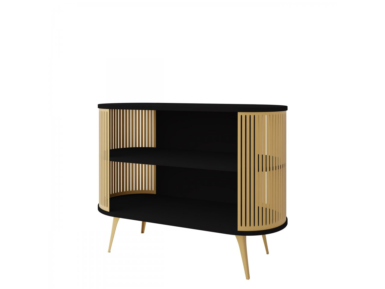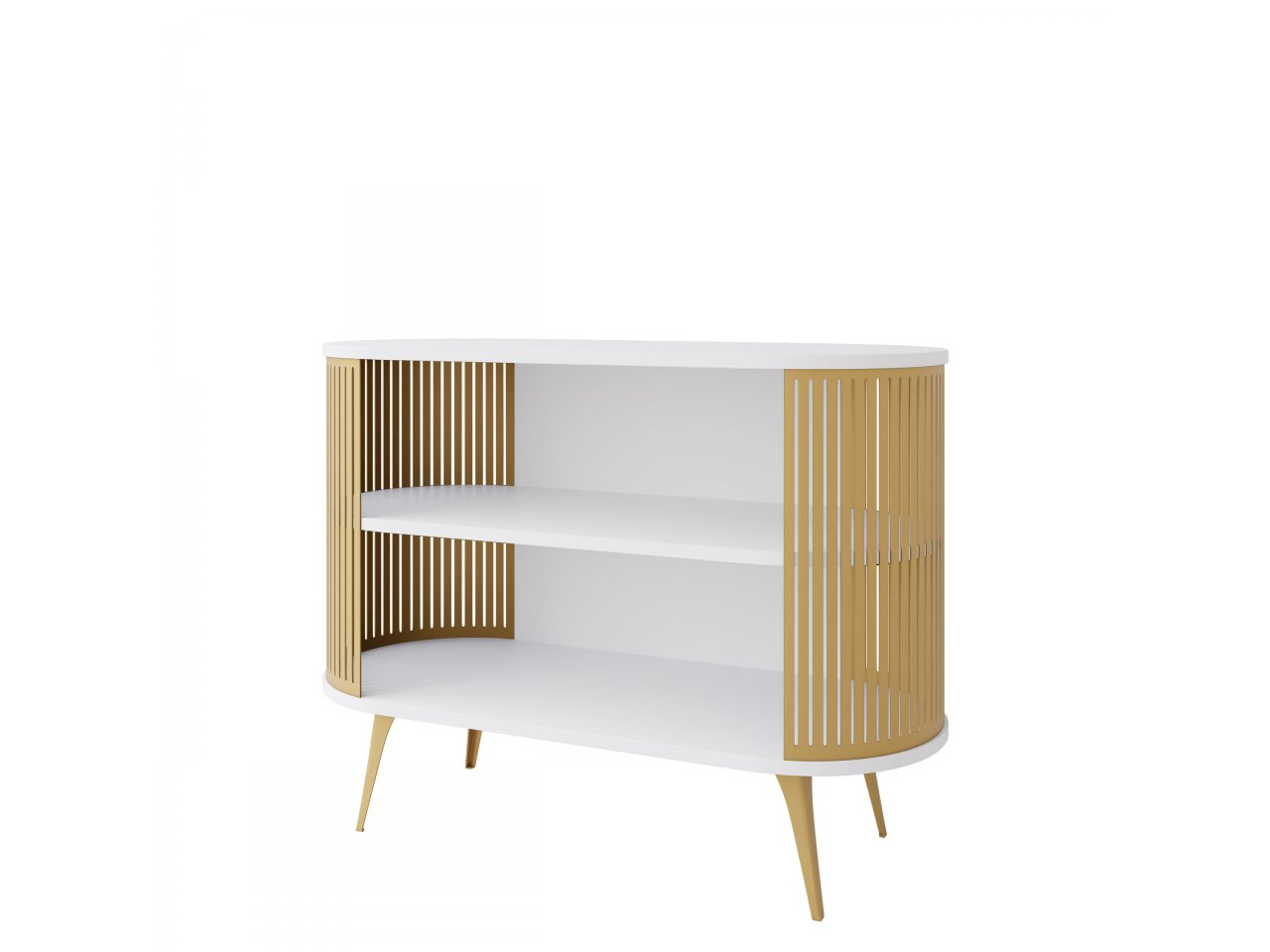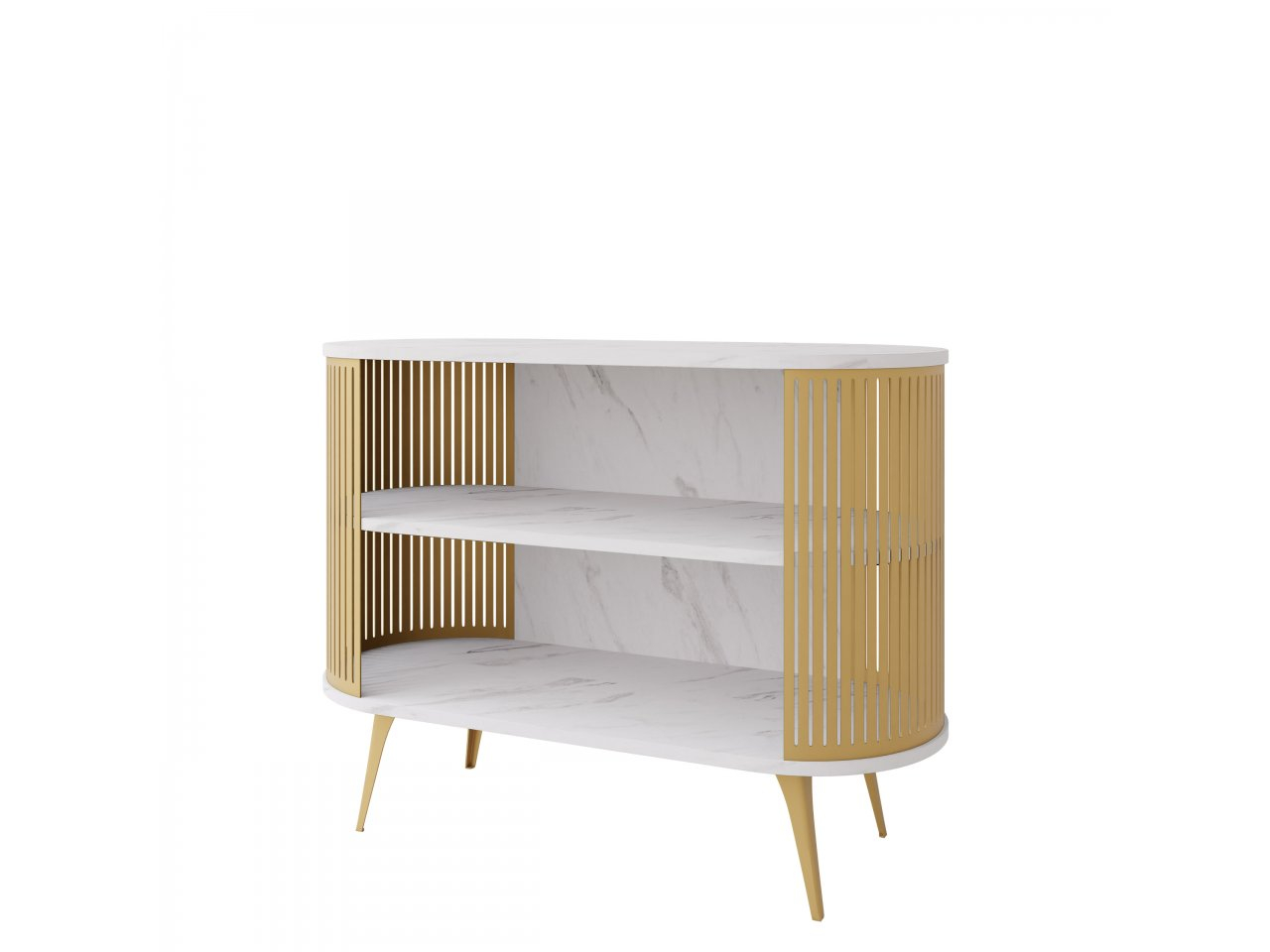 Moderná príborník Mozimo Gold s jedinečným dizajnom je vynikajúcou voľbou do každého interiéru. Stredová časť, ktorá spája vrchnú a spodnú časť stola, je vyrobená z ocele, čo zaisťuje odolnosť a elegantný vzhľad. Nohy, natreté luxusným zlatým odtieňom, zdôrazňujú jedinečný charakter tohto kusu nábytku.