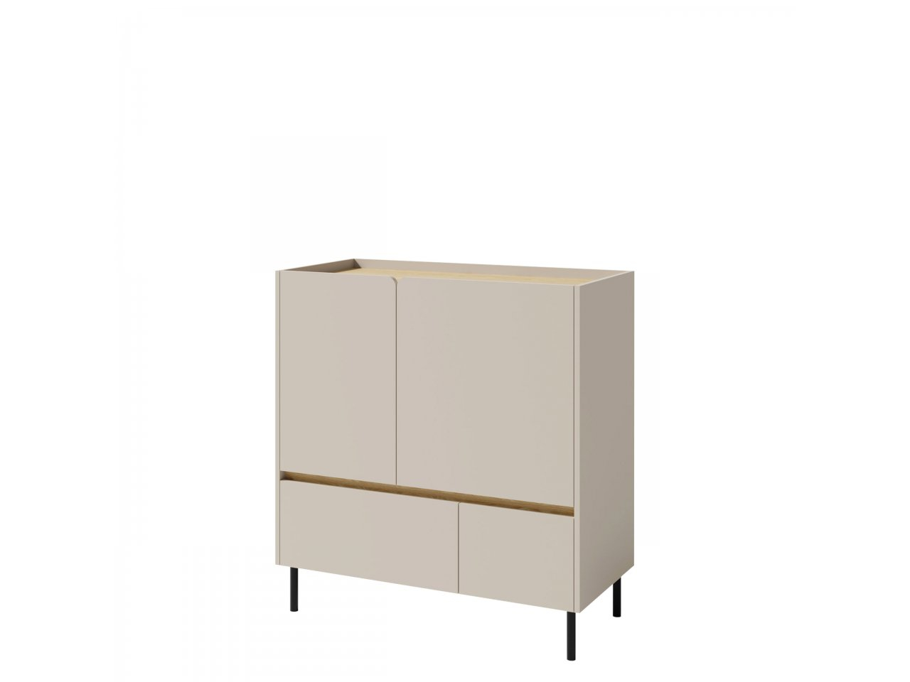 Horná časť komody obsahuje priestranné skrinky, ktoré sú ideálne na uloženie väčších predmetov, zatiaľ čo spodné zásuvky poskytujú rýchly a jednoduchý prístup k menším predmetom. Toto usporiadanie zvyšuje pohodlie a umožňuje lepšiu organizáciu.