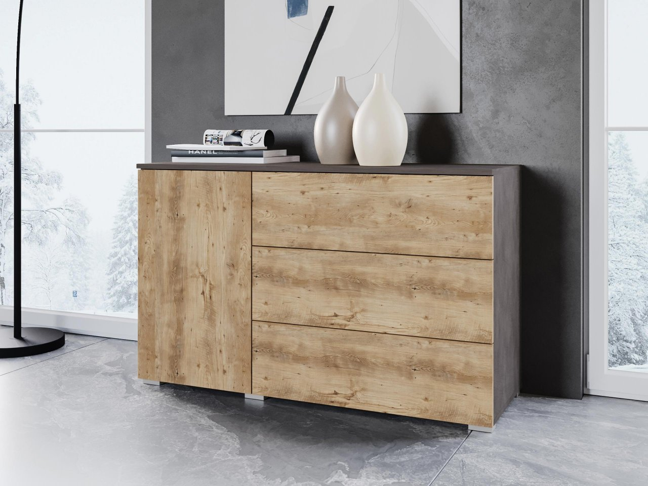Komoda Bamisio 110 sa dokonale hodí do každého interiéru. Vnesie do obývačky eleganciu a spája praktickosť s estetickou hodnotou. Rovnako dobre vynikne aj v ďalších miestnostiach.