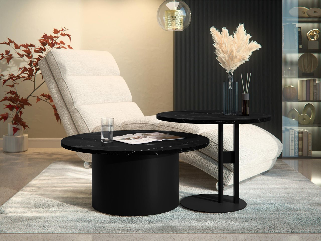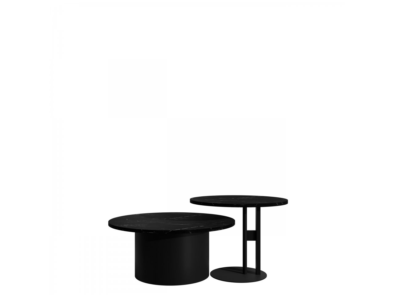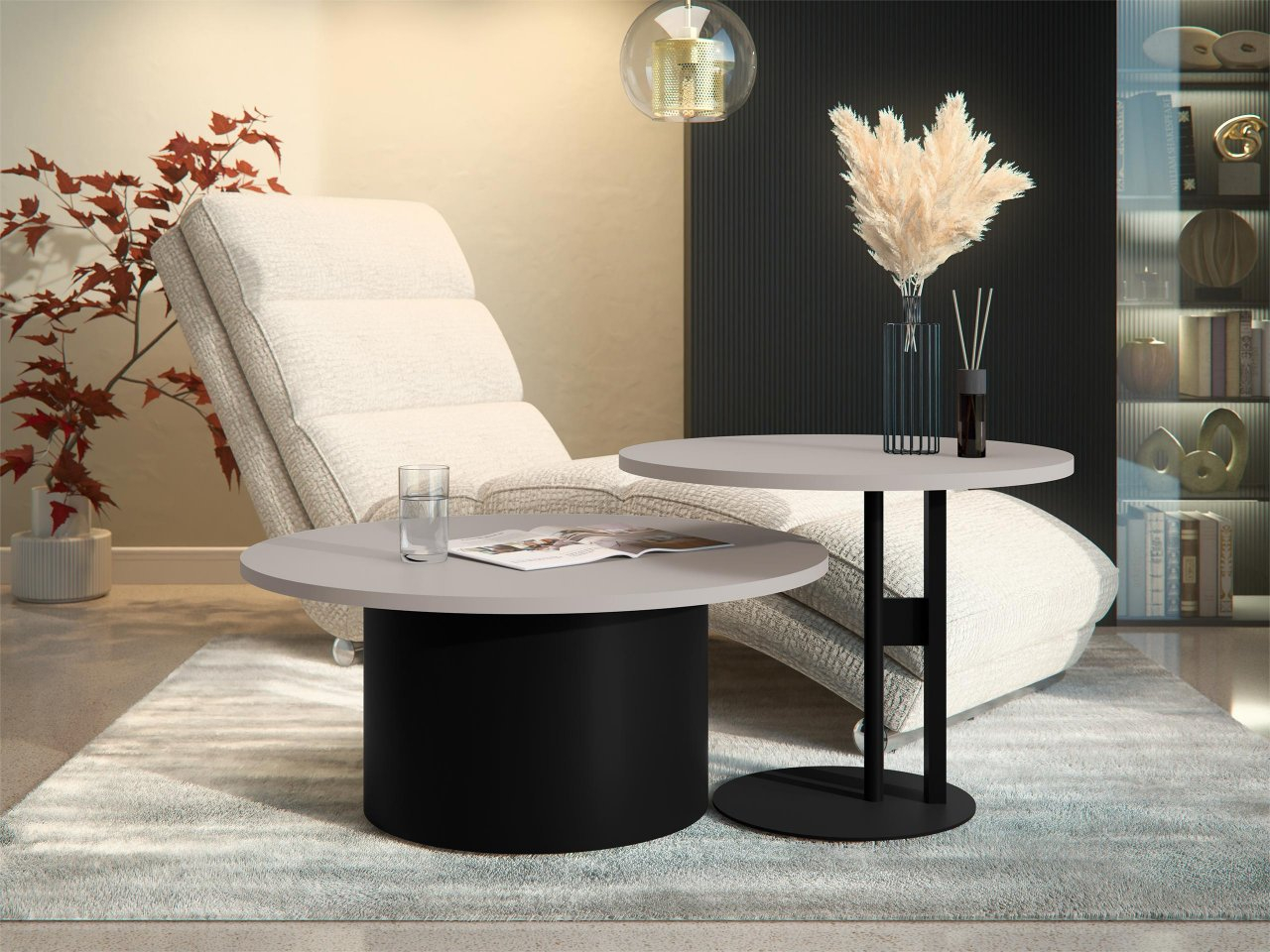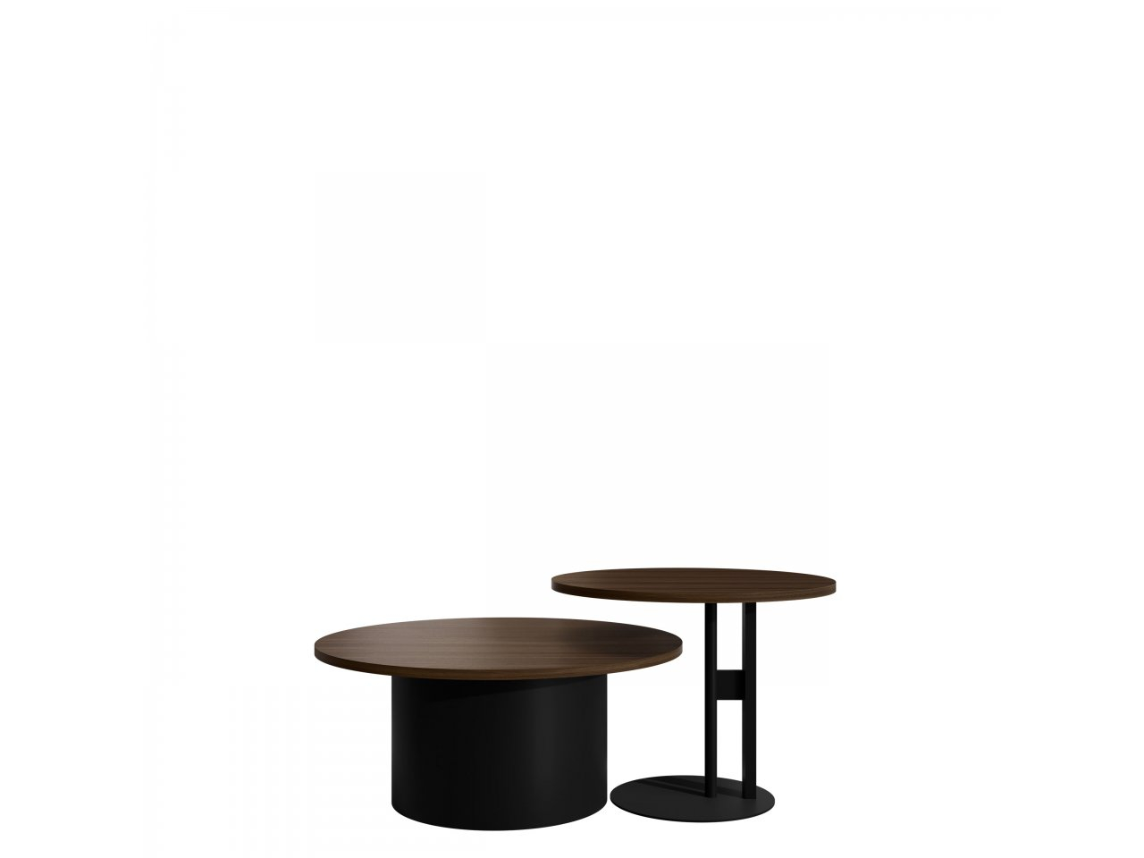 Set dvoch konferenčných stolíkov Zalisio je moderná, elegantná kompozícia založená na kontrastných farbách a tvaroch. Dve okrúhle dosky dodávajú celku ľahkosť a jemnosť. Nižší stolík stojí na pevnej valcovitej podnoži v tmavočiernej farbe, ktorá zdôrazňuje jeho stabilitu a minimalistický charakter. Vyššia verzia má štíhlu kovovú konštrukciu s geometrickými detailmi, ktoré dodávajú celku vizuálnu ľahkosť a dizajnový výraz.