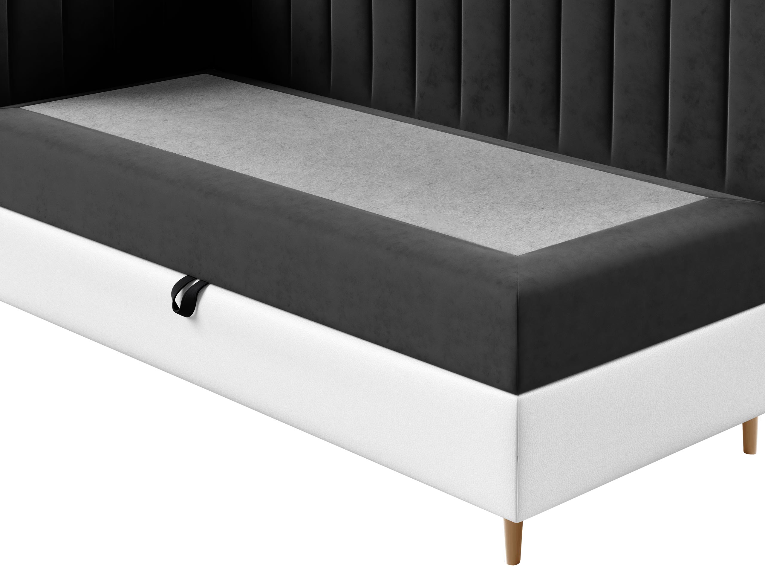 Model je vybavený úložným priestorom, ktorý sa vďaka pružinám mimoriadne ľahko otvára. Detská posteľ má tiež dva matrace: hlavný a vrchný. Topper je vyrobený z najkvalitnejších hypoalergénnych materiálov. Štyri odolné montážne gumy zaisťujú, že dobre drží na ploche postele. Nábytok je osadený na 13 cm vysokých drevených nožičkách. Celok dopĺňa rám, čalúnený na dotyk príjemnou látkou s ozdobným prešívaním.