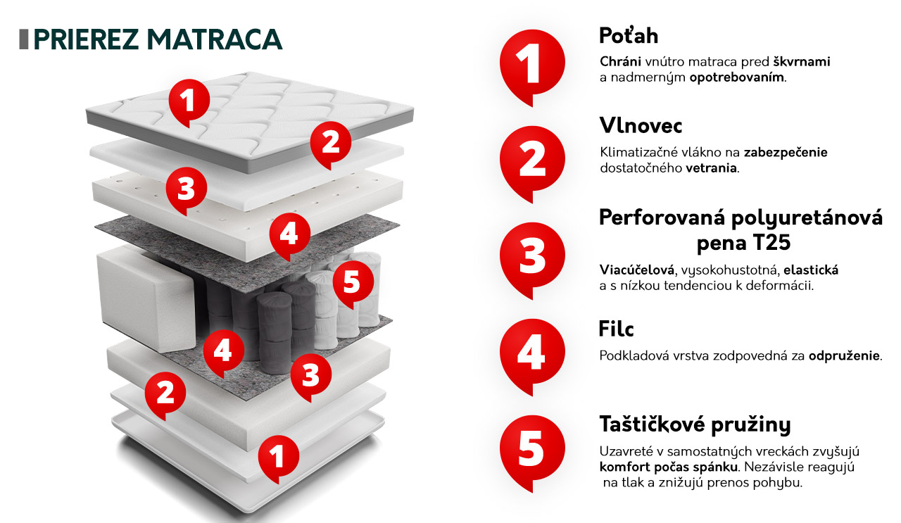 Matrac Sport I je vyrobený z pružinovej vložky so siedmimi zónami tvrdosti, ktoré poskytujú perfektnú oporu pre jednotlivé časti tela, a z dvoch druhov polyuretánových pien, ktoré zaisťujú mäkkosť a pružnosť.