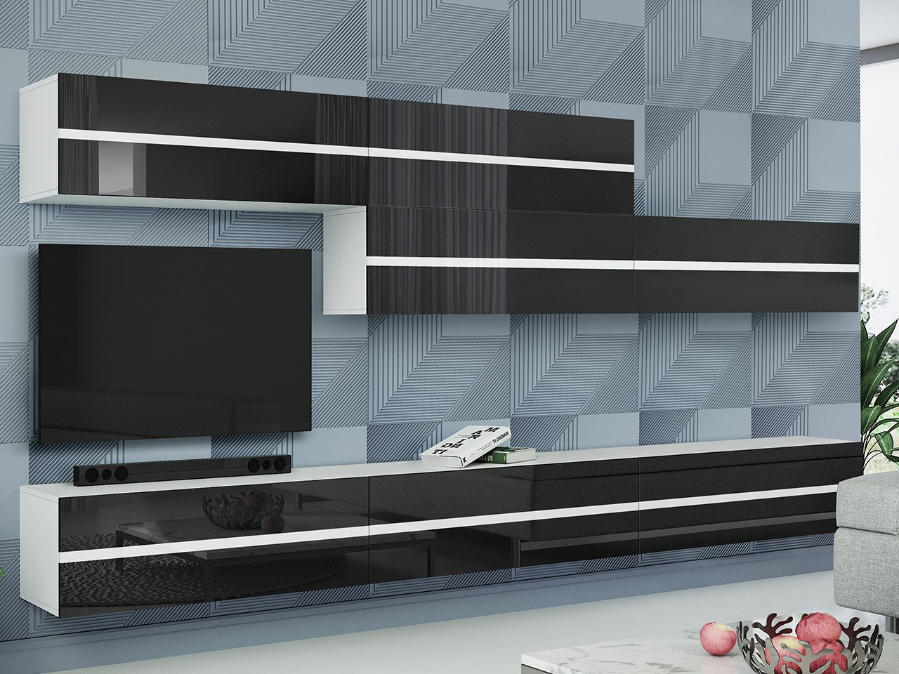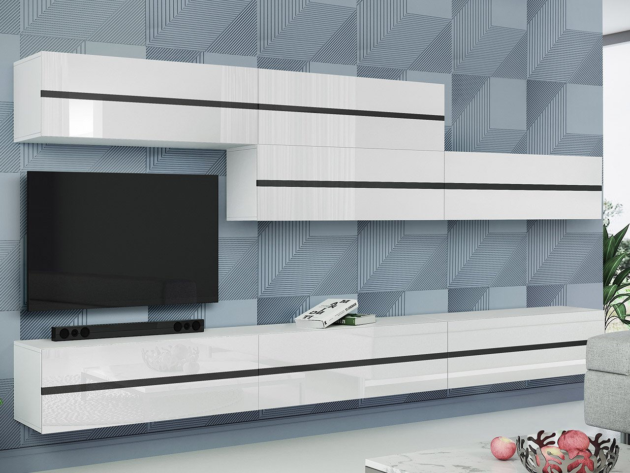 Obývacia stena Marcos IX je ideálna pre moderné usporiadanie obývacej izby. Lesklé čelá spolu s dekoratívnym prúžkom dokonale ladia s akoukoľvek farbou stien a ďalšími prvkami dekoru.