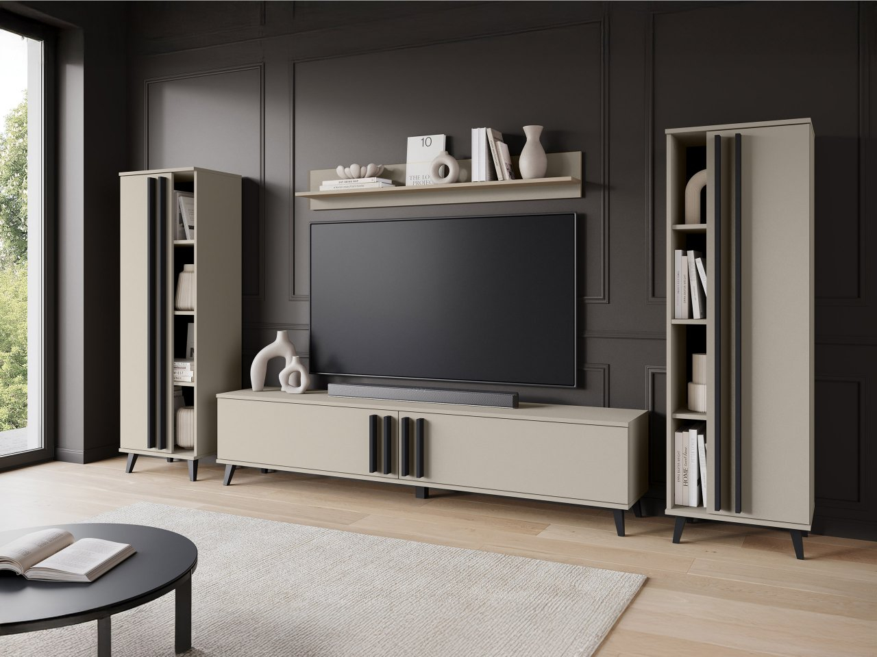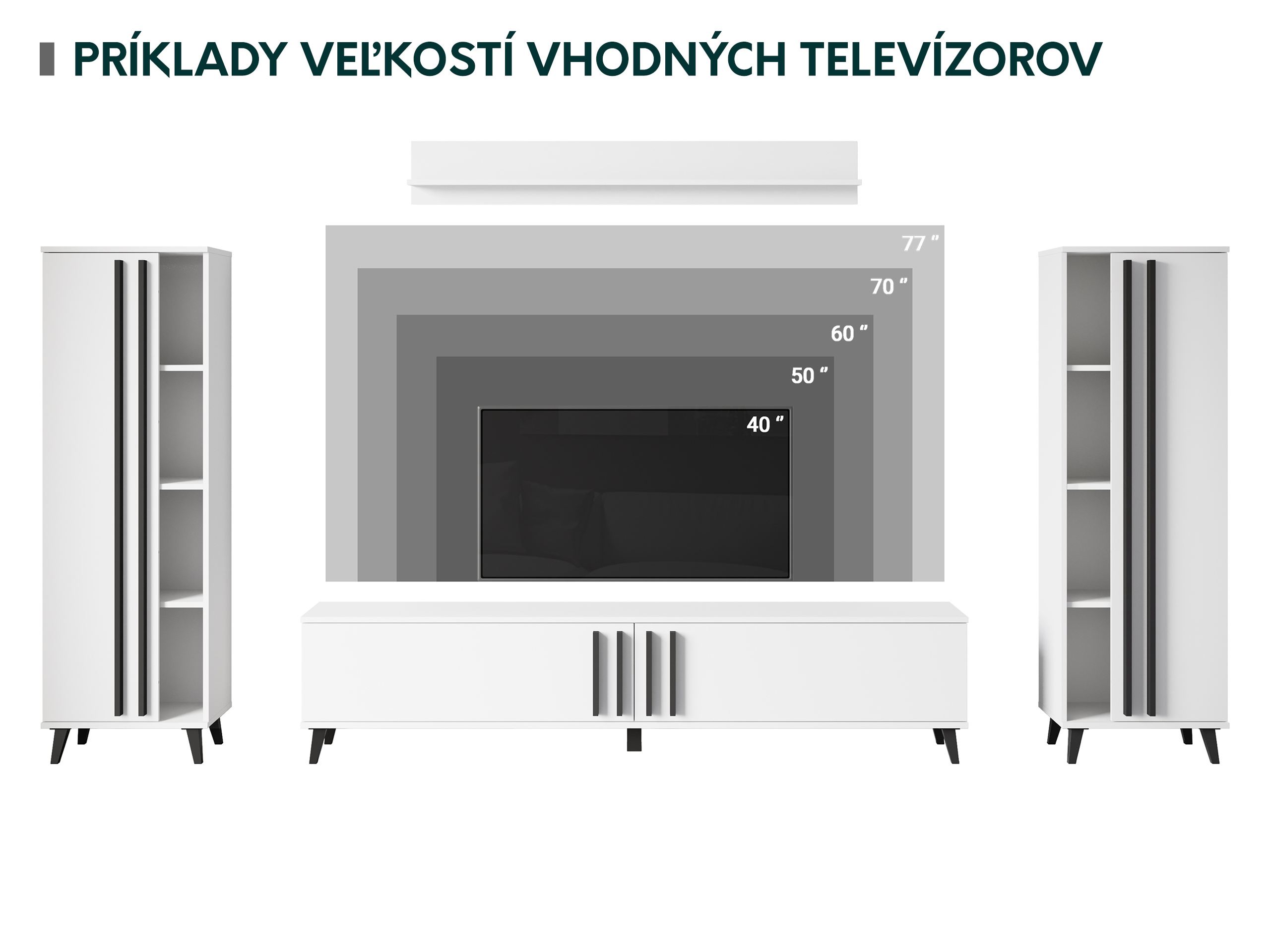 Dobre zvolené prvky vytvárajú ucelený a esteticky príjemný dizajn obývačky. Jednou z možností, ktorá dodá tomuto priestoru ohromujúci efekt, je nástenná obývačka Kegalo I. Tento nábytok do obývačky ponúka nezvyčajnú kombináciu. Nájdete tu dve knižnice s uzavretou časťou pre diskrétne úložné priestory, široký TV stolík a nástennú policu.
