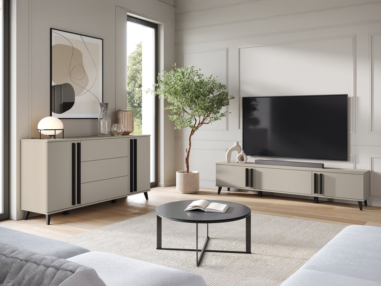 Hľadáte plne vybavenú obývačku? Zariaďte ju štýlovo a prakticky so súpravou nábytku do obývačky Kegalo III. Súprava obsahuje širokú komodu a TV stolíky, ktoré ponúkajú dostatok úložného priestoru. Majú priestranné priehradky a hlboké zásuvky. Nábytok je postavený na vysokých nohách, ktoré mu dodávajú nádych ľahkosti a elegancie. Skrinky sa otvárajú systémom push-to-open a štýlové úchytky dodávajú súprave jedinečný charakter.