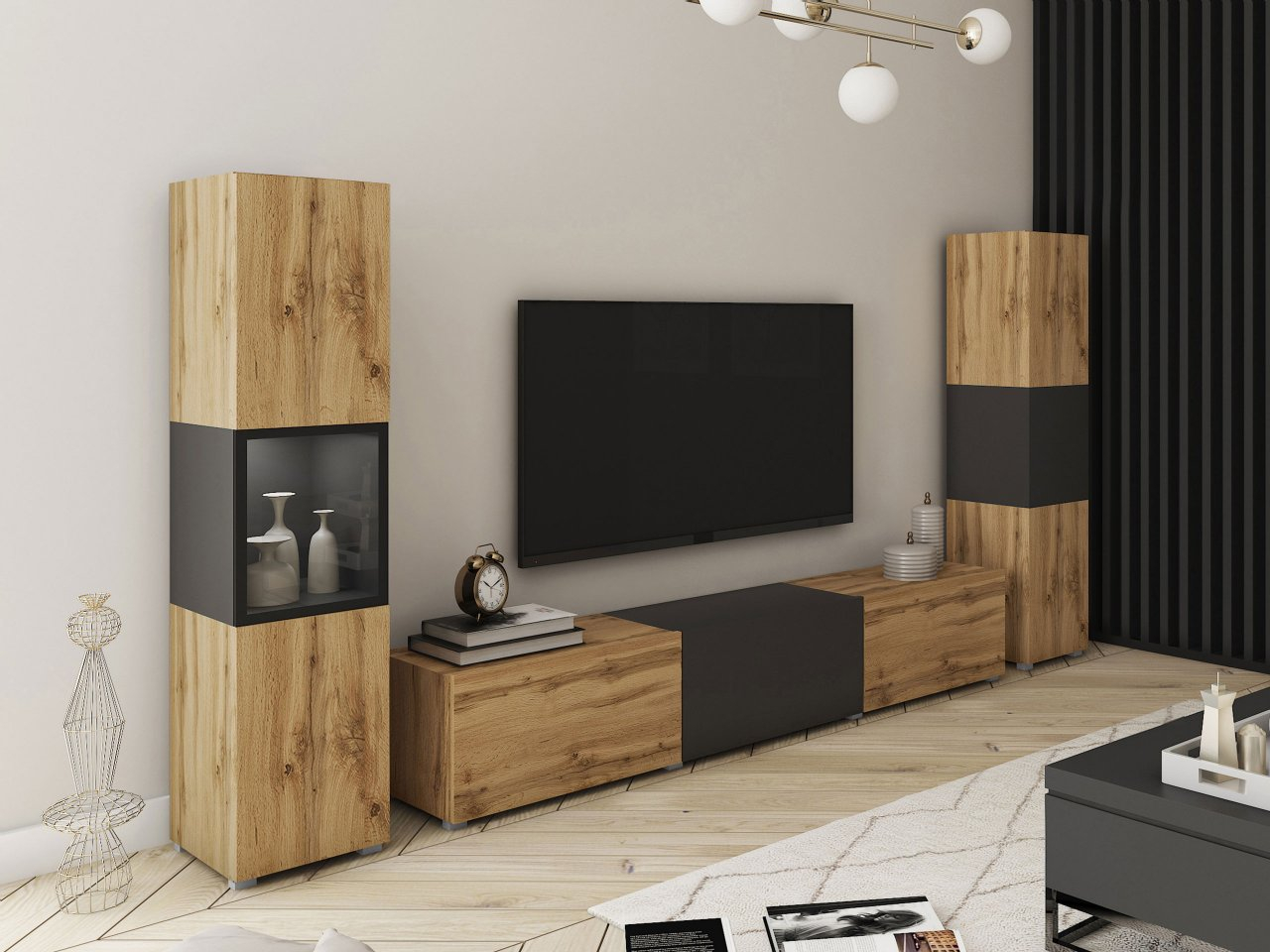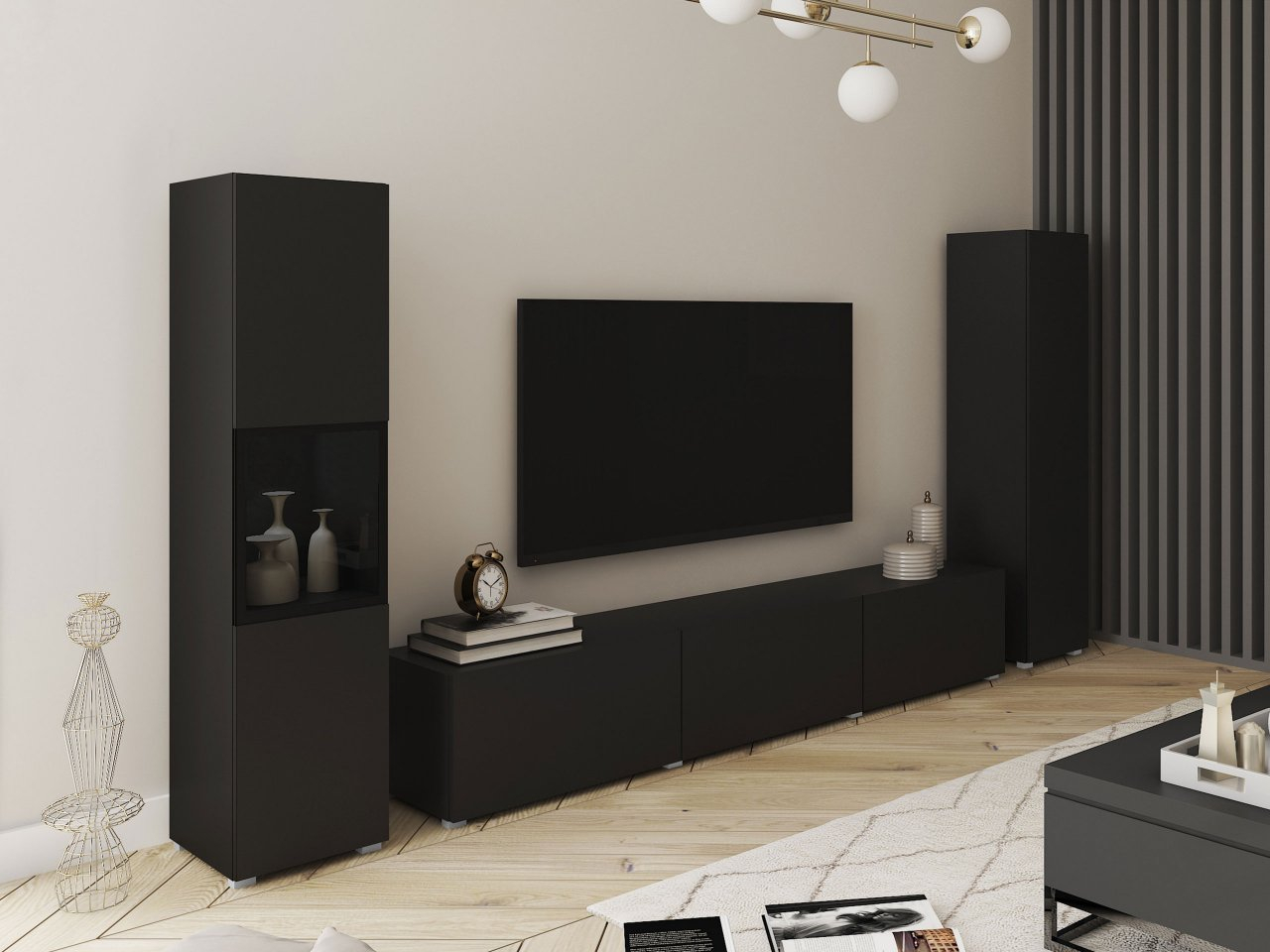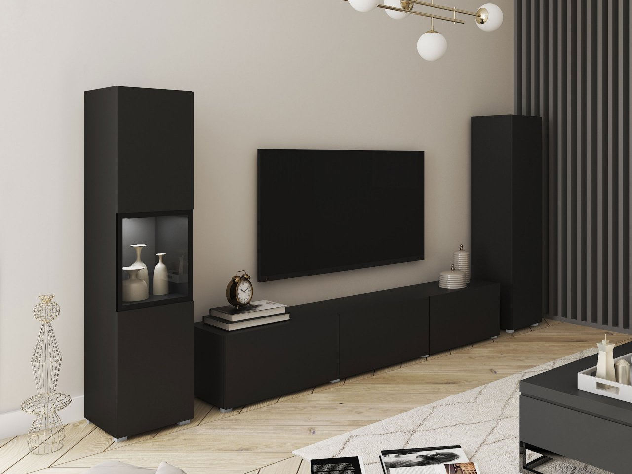Štýlová a praktická nástenná skrinka Zinigo III dokonale doplní moderný interiér a spojí estetiku s jednoduchým používaním. Súprava pozostáva zo sklenenej vitríny, pevnej vitríny a TV stolíka. Nábytok je možné zavesiť alebo umiestniť na priložené nohy – všetko záleží na vašom usporiadaní.