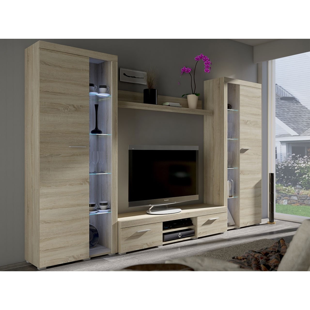 Extrémne funkčná súprava nábytku pozostáva predovšetkým z vysokej skrinky. Vďaka systému delených políc získate praktický úložný priestor. Záverečná časť je priestranná polica na doplnky, zatiaľ čo vitrína je zdobená sklenenými policami na dekorácie a rodinnými suvenírmi. V ďalšej možnosti si môžete kúpiť LED osvetlenie, ktoré dodá vášmu interiéru atmosférickú žiaru.
