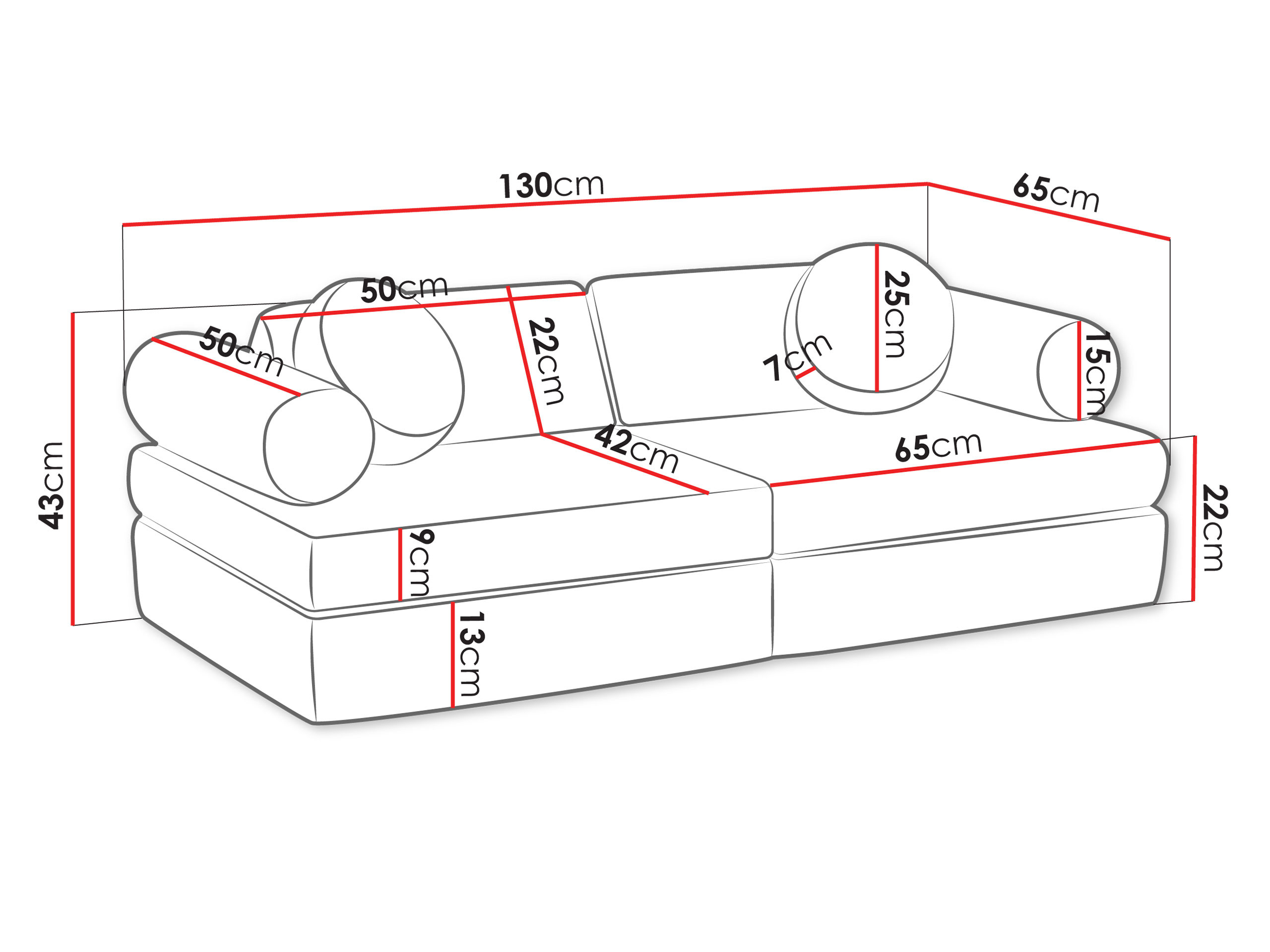 Detská pohovka je čalúnená menčestrovou látkou, ktorá je mäkká na dotyk, odolná a bezpečná pre deti. Detská pohovka nezaberá veľa miesta, so šírkou 130 cm je perfektným doplnkom do detskej izby.