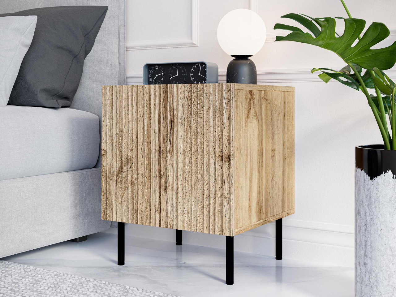 Set nočných stolíkov tvoria dva kusy nábytku upevnené na nožičkách. Vnútri je praktický úložný priestor na veci, ktoré sa oplatí mať vždy po ruke. Otvárajú sa vďaka systému PUSH TO OPEN. Skrinky vyzerajú mimoriadne úhľadne a ich ďalšou výhodou sú kovové nohy, ktoré uľahčujú čistenie.