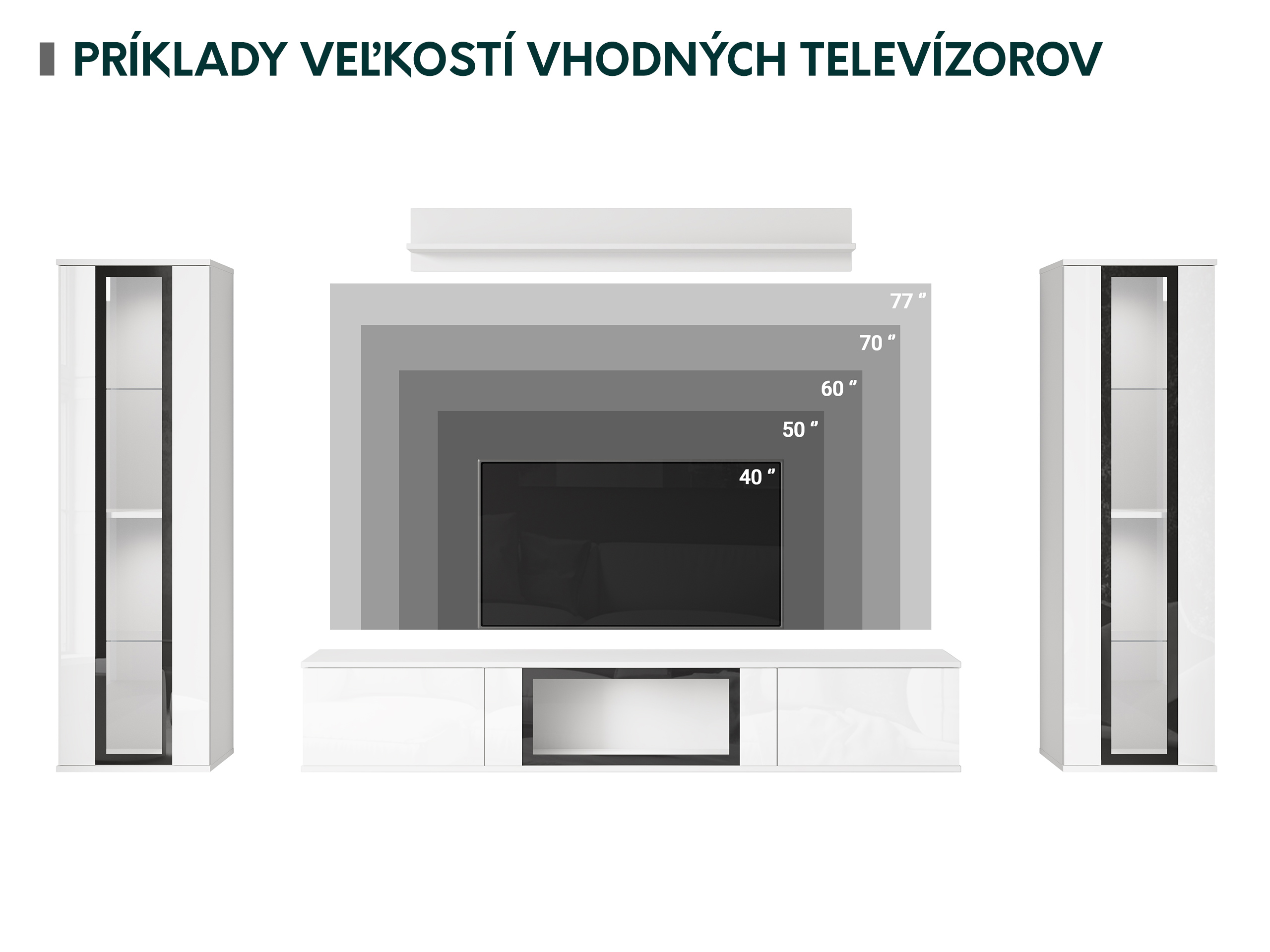 Starostlivo premyslená zostava obsahuje najpotrebnejšie prvky v obývacej izbe. Zostava poskytuje majiteľovi dve závesné vitríny, TV skrinku na odkladanie vecí a závesnú policu na drobné dekorácie. Výhodou každého prvku je presklená výstavná časť. Vďaka tomu je vzhľad nábytku atraktívnejší a zároveň sa zvýrazňujú predmety umiestnené na policiach.