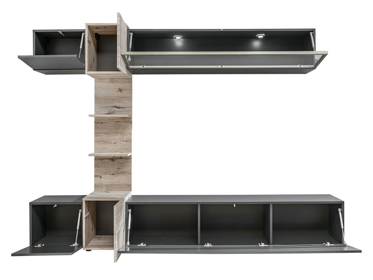 Obe časti obývacej steny sú spojené úzkym stenovým panelom, ktorý poskytuje ďalšie police.