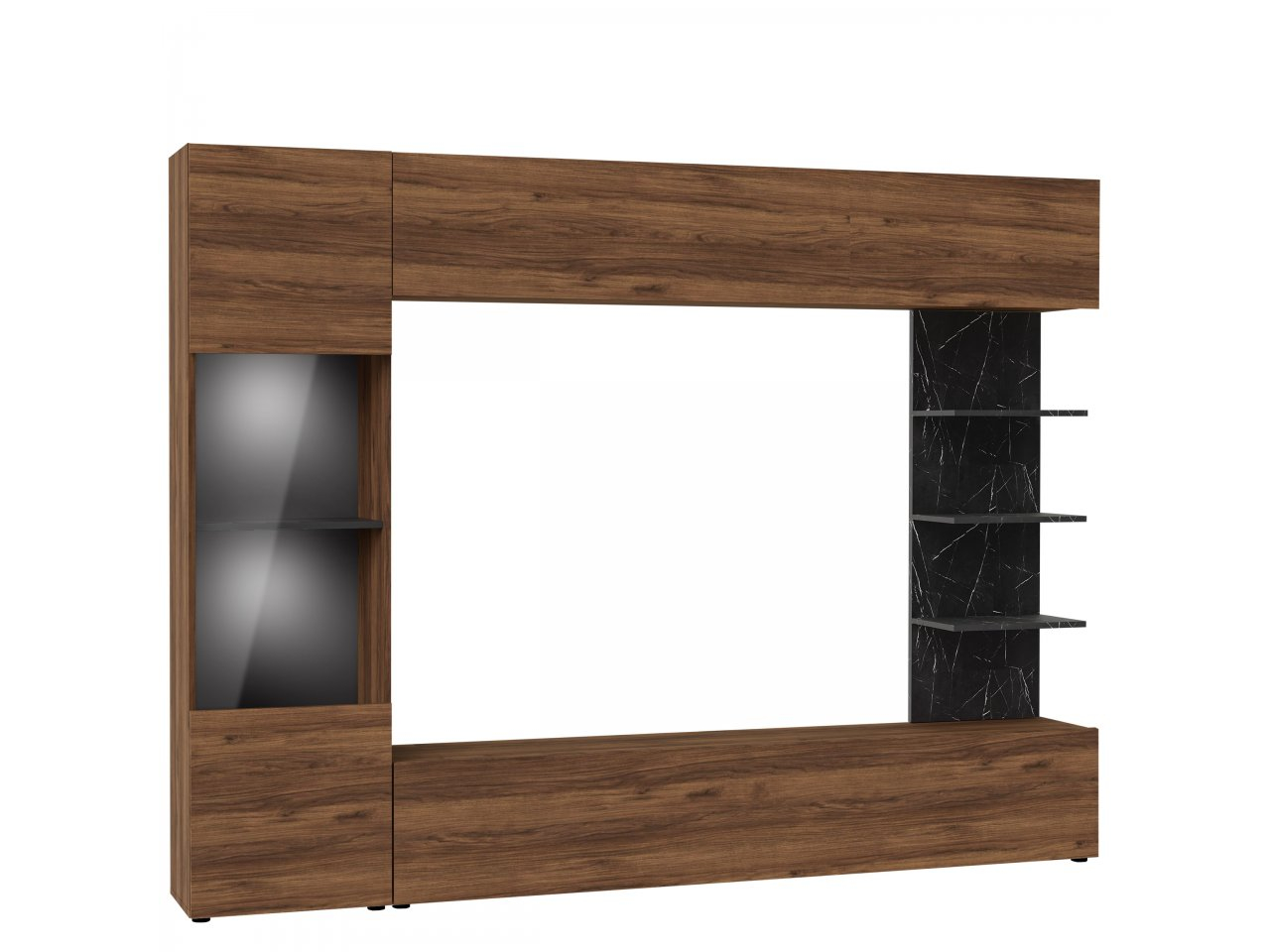 Základným prvkom každej obývacej steny je TV skrinka, ktorá perfektne vystaví váš televízor. Dodatočný úložný priestor poskytuje nástenná skrinka, ktorú môžete umiestniť nad multimediálne zariadenia. Ďalšou výhodou obývacej steny je vitrína so sklenenými vložkami. Je ideálna na vystavenie dekorácií.