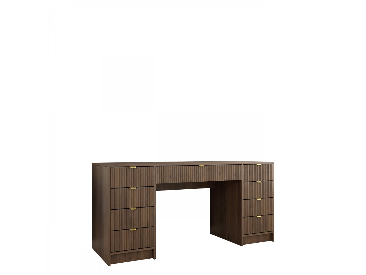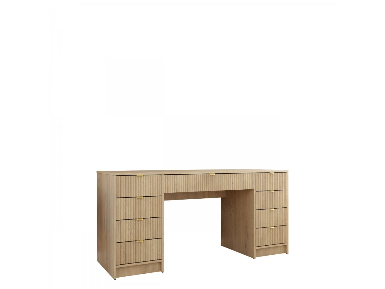 Písací stôl so zásuvkami je skvelý spôsob, ako si zorganizovať priestor. Priestranné úložné priestory uľahčujú usporiadanie priestoru. Celý písací stôl je doplnený frézovaním na čelách zásuviek a úchytkami zlatej farby.