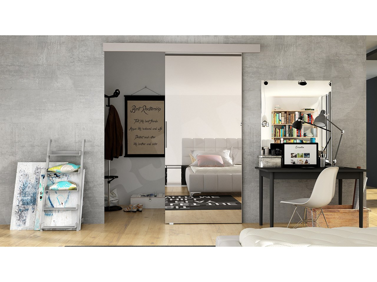 Vysoko kvalitné nástenné posuvné dvere Opera sú modernou náhradou za tradičné krídlové dvere. Výhodou ich inštalácie je hospodárne využitie priestoru. Dverné krídlo posuvné po stene nezaberá takmer žiadny priestor.