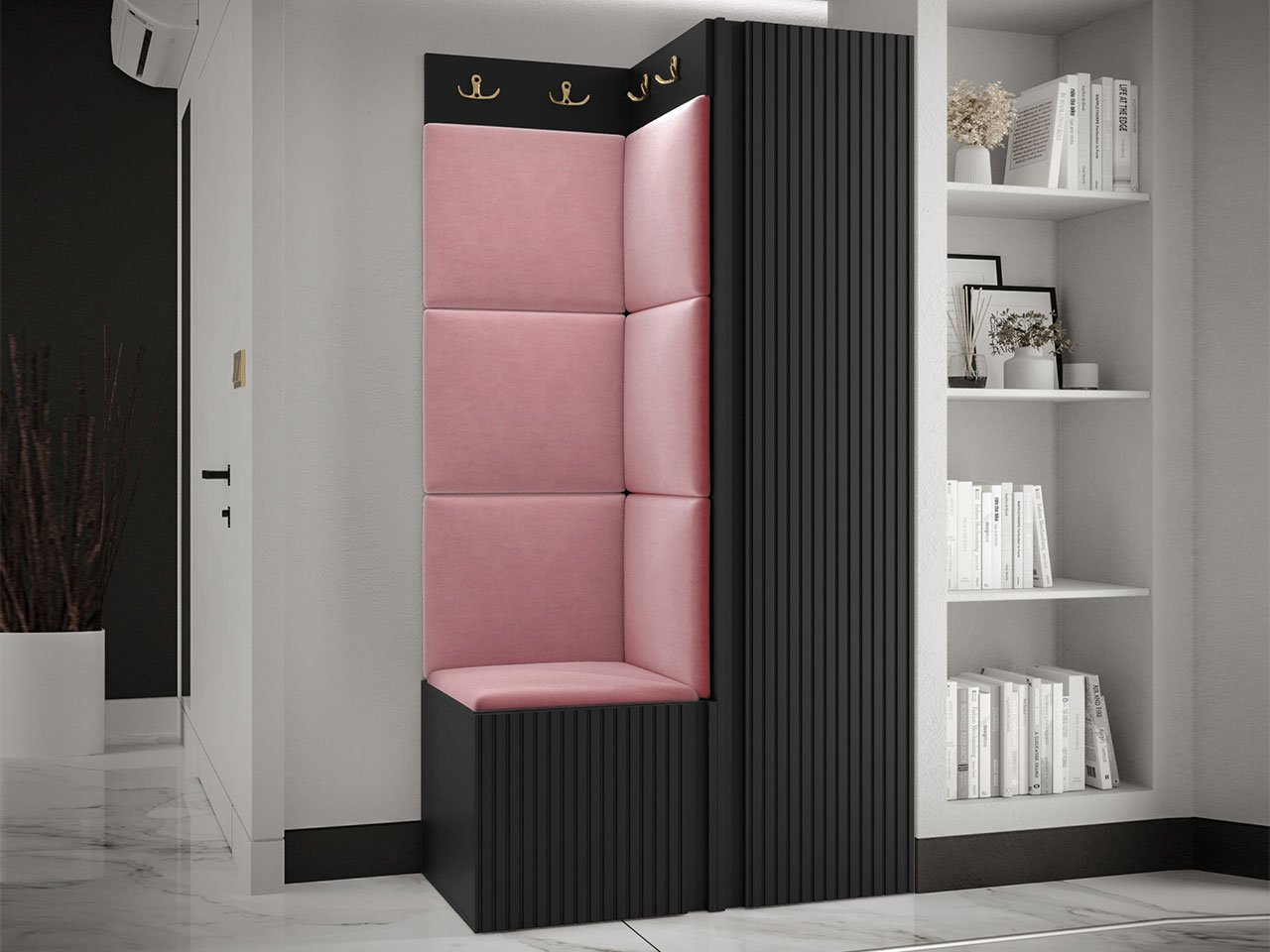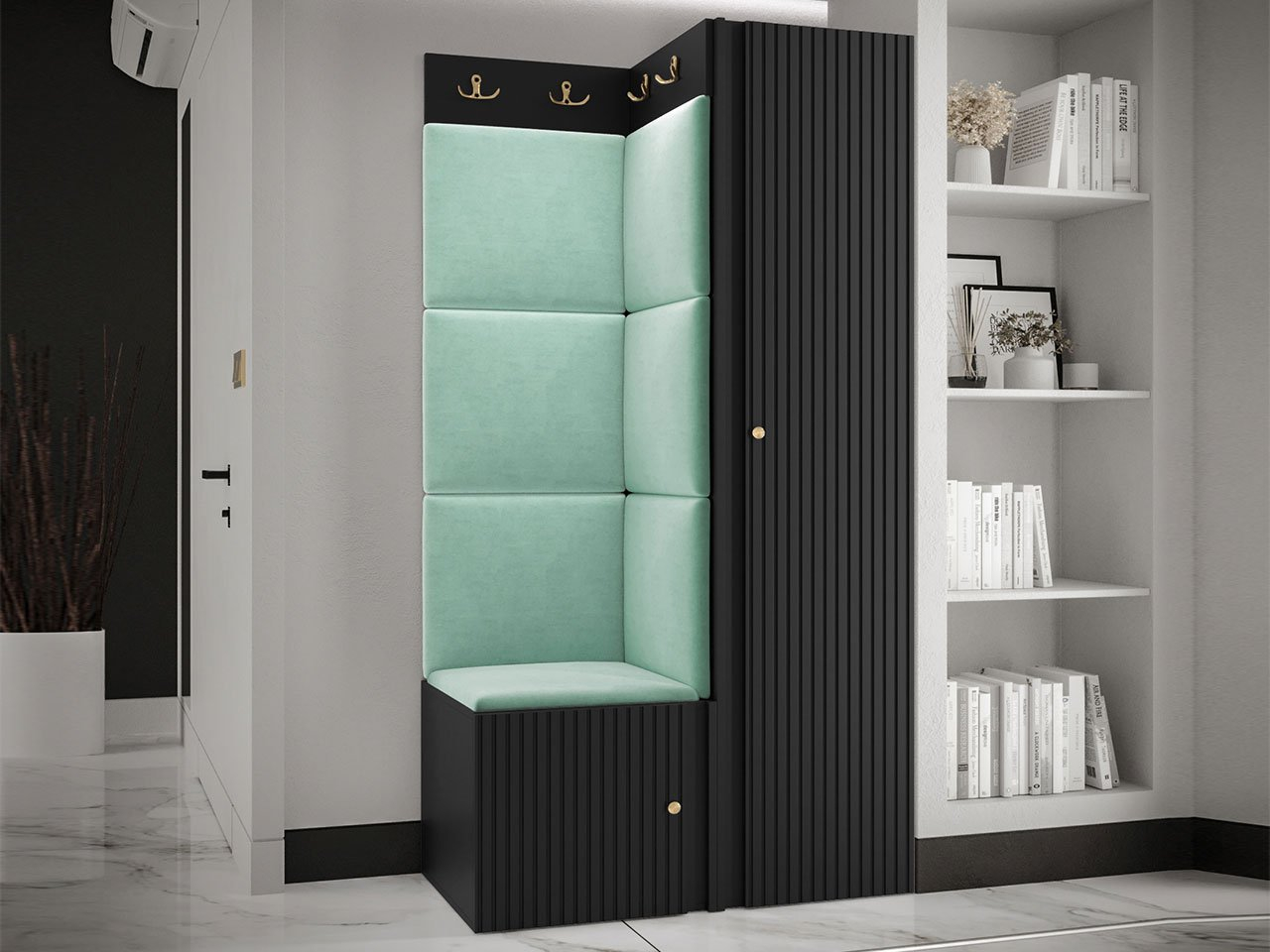 V zostave je okrem jednodverovej skrine aj botník so sedákom a panel s vešiakmi. Dekoratívne vlastnosti haly zdôrazňujú čalúnené panely. Kocky pripevnené na stenu sú módnym doplnkom dekorácie. Pomocou ich praktických úprav ochránite steny aj pred nečistotami a poškodením.