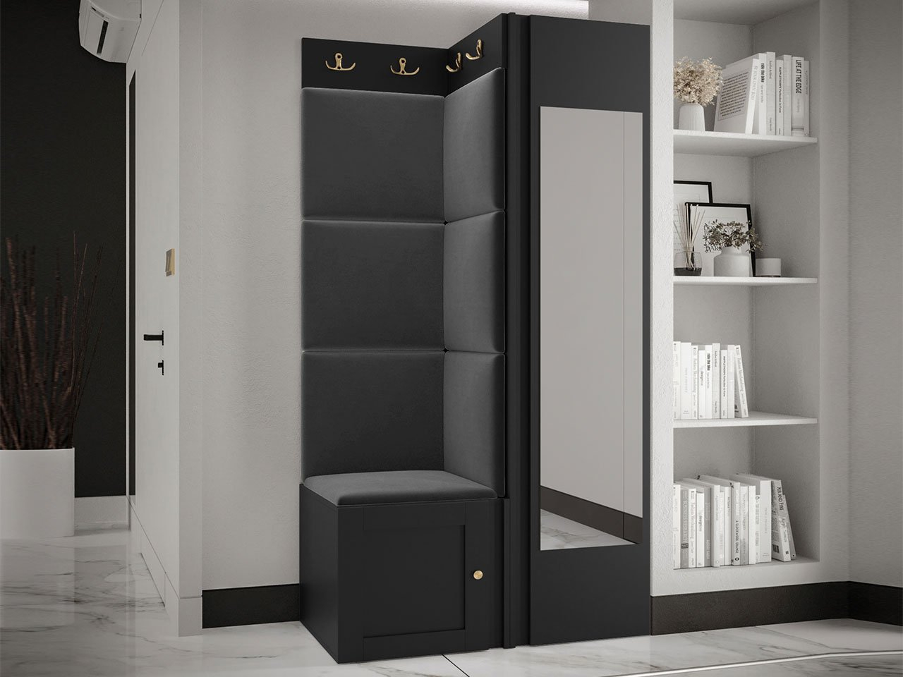 Pozoruhodné sú zlaté prvky a mäkké čalúnené panely. Do interiéru vnesú mimoriadnu útulnosť a extra pohodlie. Pohodlné sedadlo je priestor na obúvanie alebo vyzúvanie. Hneď pod ním je miesto na topánky. Skriňa so zrkadlom je kľúčovým prvkom šatníka. Vybavený dvoma dvojitými vešiakmi vytvorí priestor na kabáty všetkých členov domácnosti.