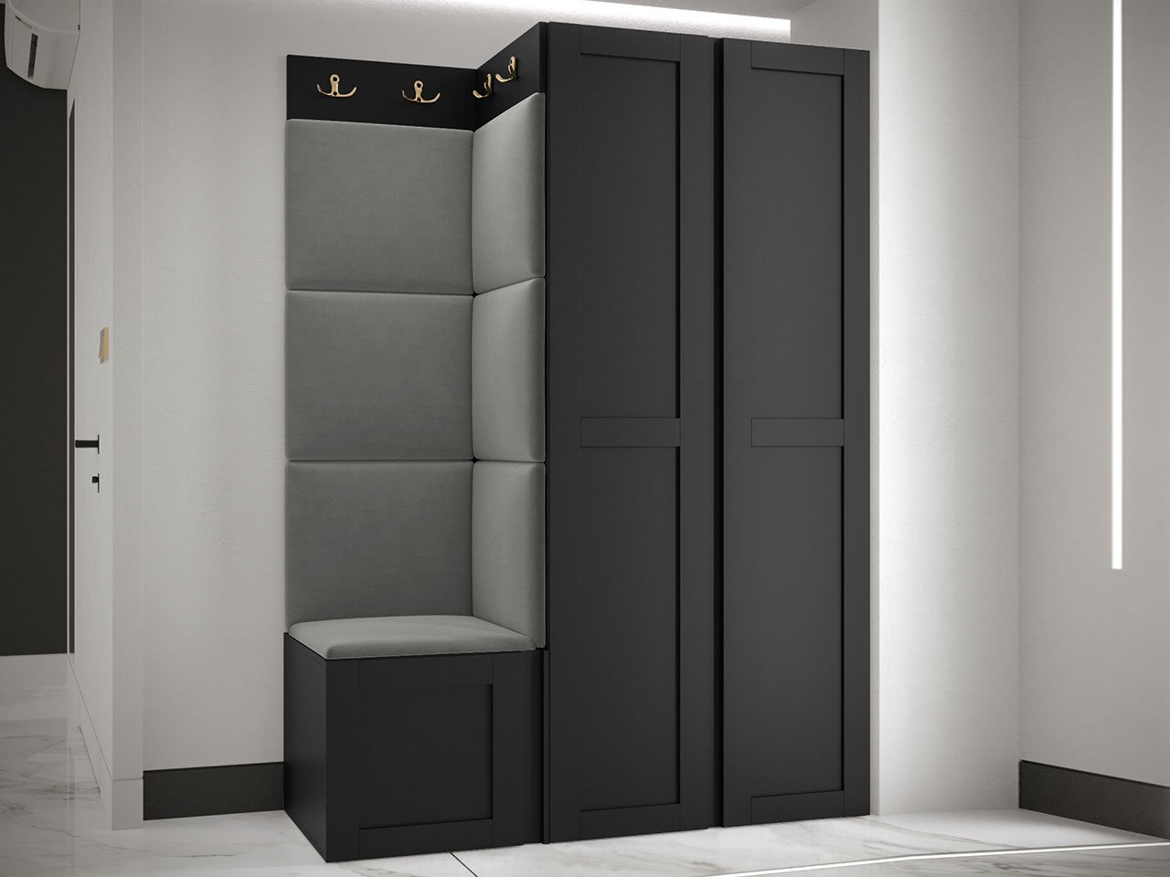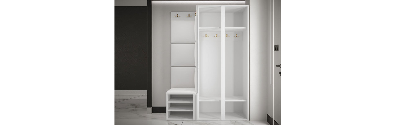 Elegantná predsieňová zostava Terospito XXIII so šatníkovou skriňou je priestranným a funkčným riešením na uloženie oblečenia a obuvi. Súčasťou tohto modelu sú aj vešiaky a skrinka na topánky. Jeho výnimočne dekoratívna časť je vyrobená z čalúnených panelov, ktoré majú tiež vlastnosti pohlcujúce zvuk a ochranné vlastnosti. Nábytok umožňuje pohodlné uloženie rôznych druhov oblečenia a obuvi.