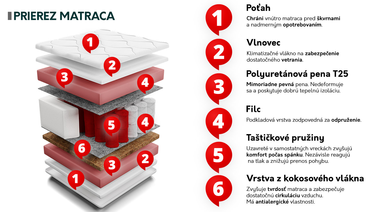 - taštičková pružina H-12 cm, 256 prameňov / m2 + kokosová vložka,