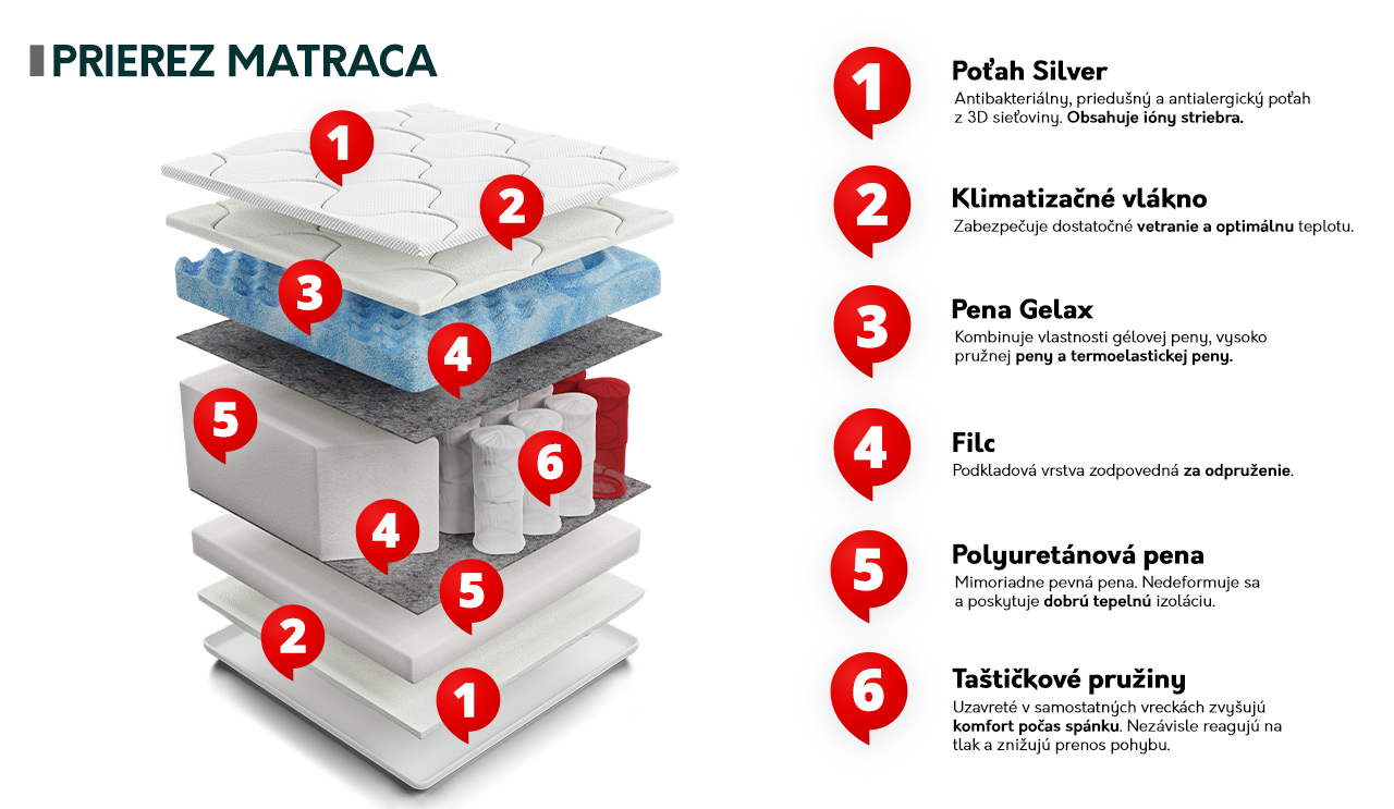 Matrac má poťah so zipsom, ktorý vďaka obsahu iónov striebra získal antibakteriálne vlastnosti, čo výrazne zvyšuje jeho kvalitu a úroveň používania.