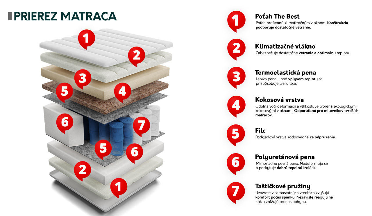 - vložka z vreckových pružín, 7 zón, má veľa oporných bodov, ktoré vám umožňujú zachovať prirodzené krivky tela počas spánku, každú pružinu vo vnútri produktu umiestnenú v samostatnom vrecku, vďaka ktorej funguje nezávisle od ostatných,