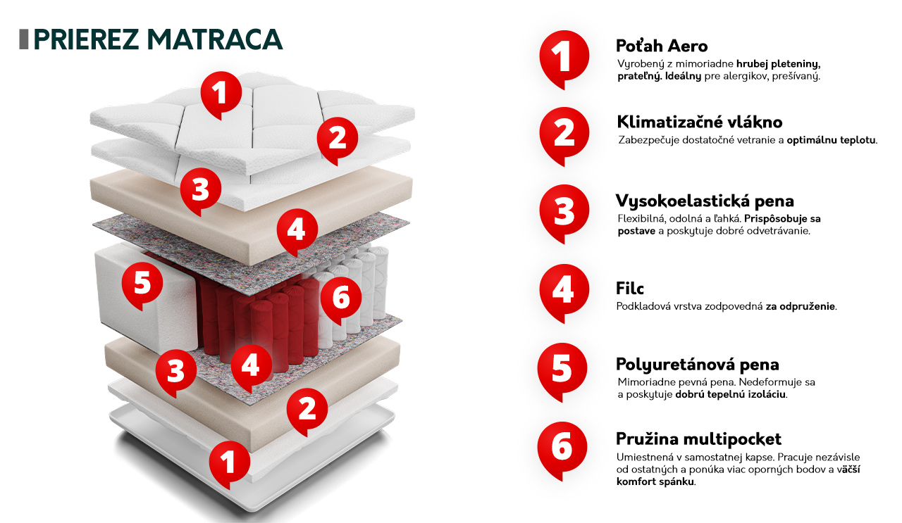 Jeho základom je viacvrstvová vložka, ktorá sa skladá z množstva pružín umiestnených v samostatných vreckách. Táto vlastnosť znamená, že keď budete oddychovať so svojím partnerom, nebudete cítiť žiadne jeho pohyby. Ide o vynikajúcu možnosť na fidgeting!