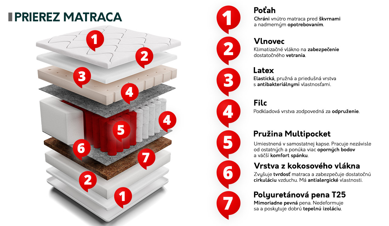 Matrac je obohatený o vrstvu latexovej peny a vytvára optimálnu oporu pre celé telo. Komfort spánku je navyše podporený siedmimi zónami tvrdosti, ktoré sa prispôsobujú každej časti chrbtice a podporujú zdravé a pohodlné polohovanie počas odpočinku.