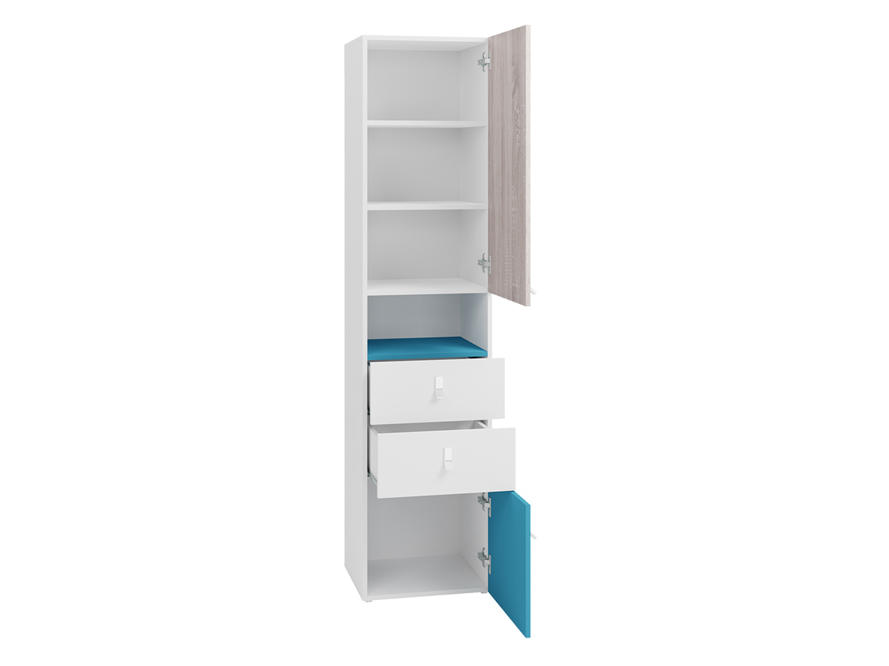 Legimi LG04 je knižnica, vďaka ktorej vaše dieťa získa ďalší priestor na uloženie potrebných školských doplnkov, kníh alebo oblečenia. Tento model je vybavený skrinkami s vnútornými policami, zásuvkami a poličkou na malé dekoratívne prvky.