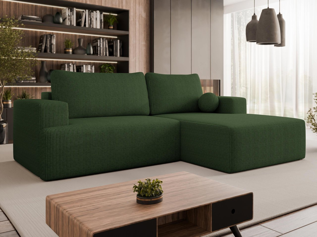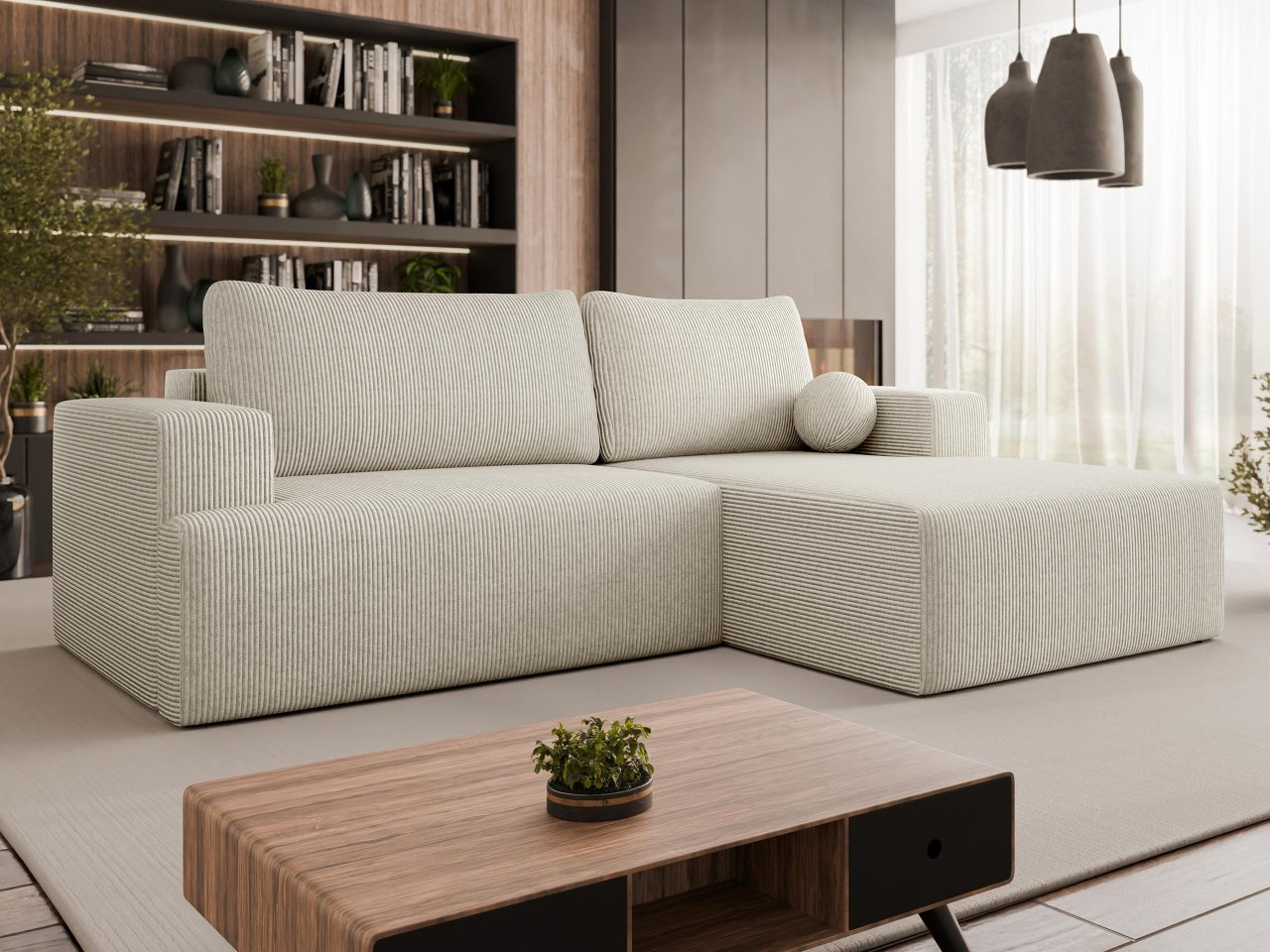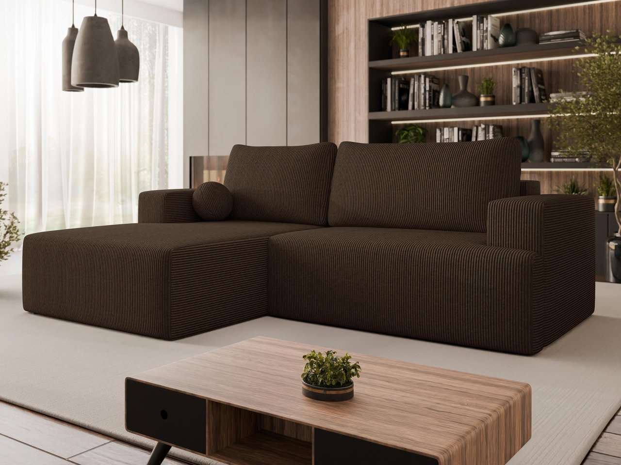 Objavte kombináciu rebrovaného pohodlia a praktických vymožeností. Rohová rozkladacia pohovka Dmiore je čalúnená manšestrovou látkou, ktorá poskytuje príjemne mäkký pocit a krásny vzhľad. Je perfektná ako ústredný bod obývačky a poskytuje miesto na relax počas filmových večerov.