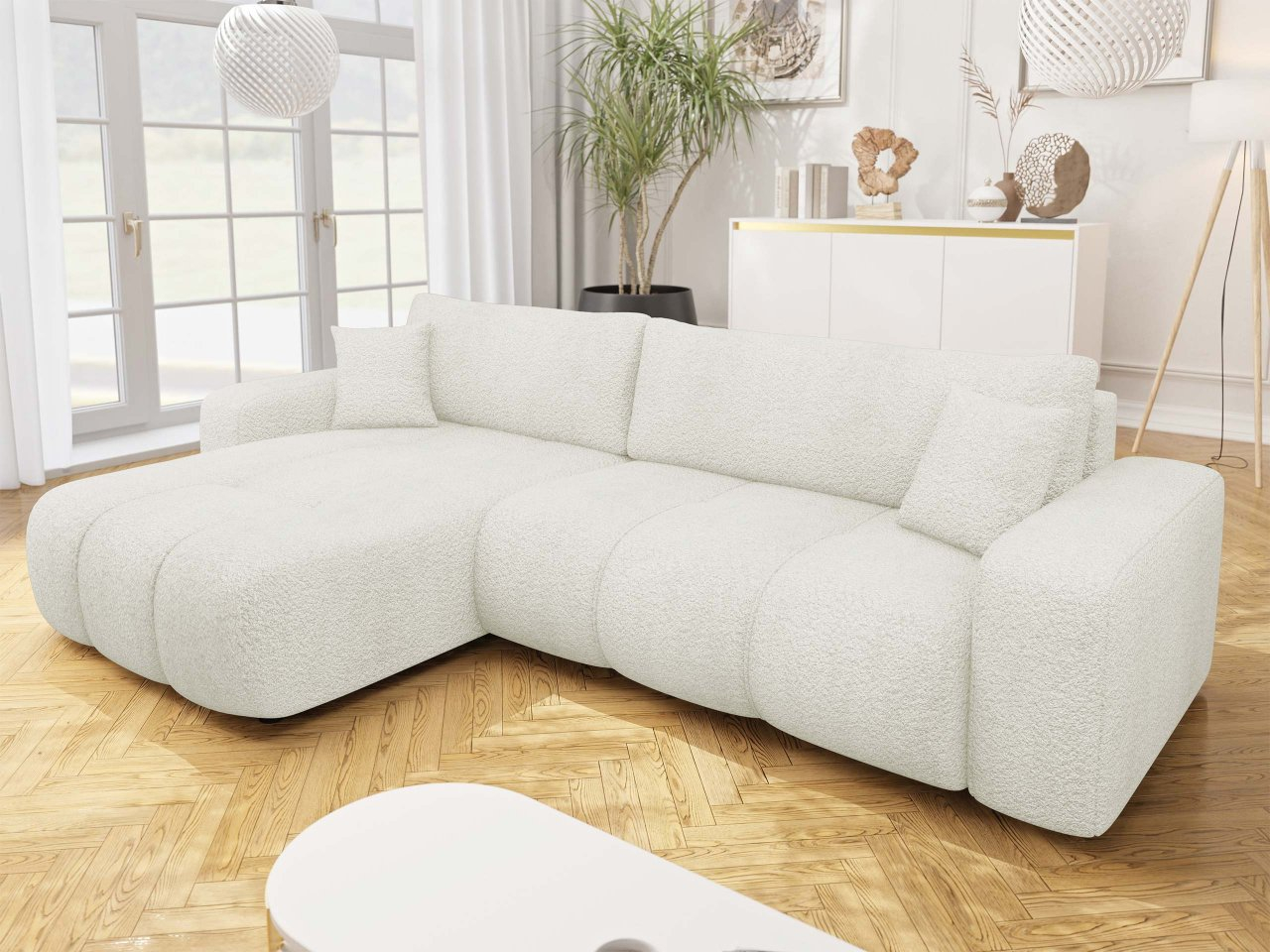 Zariaďte si obývačku rohovou rozkladacou sedačkou Larow Maxi Boucle. Tento mimoriadne moderný model kombinuje pohodlie, funkčnosť a estetiku. Jeho praktický dizajn v tvare L vynikajúco doplní priestor, zatiaľ čo dodatočná funkcia spania vám umožňuje jednoducho ju premeniť na pohodlnú posteľ. Toto riešenie je ideálne pre každodenný relax, ako aj pre neočakávané návštevy hostí.