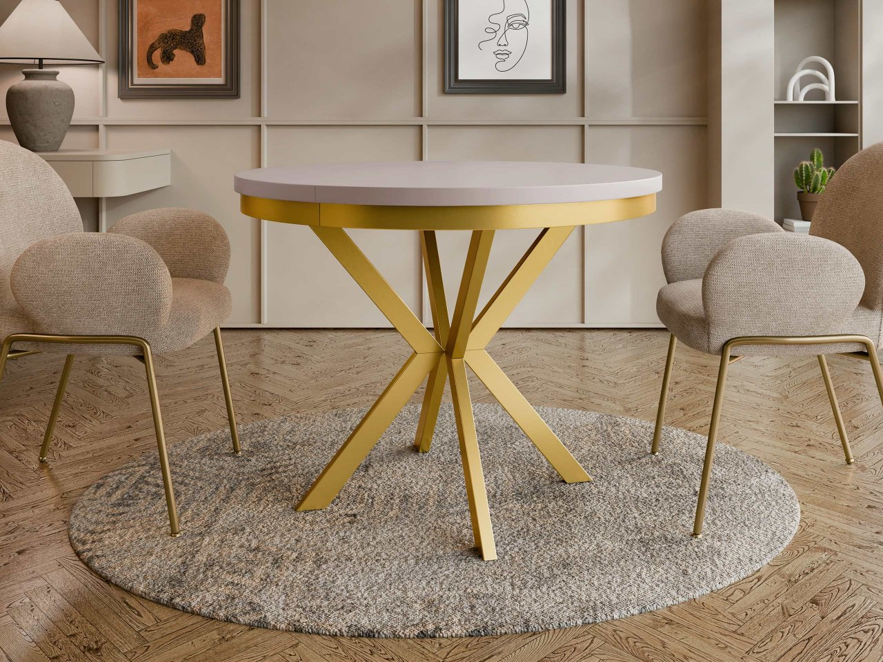 Vneste do svojej jedálne eleganciu, modernosť a funkčnosť. Rozkladací stôl Azglo Gold 100 kombinuje eleganciu a praktickosť. Jeho jedinečný dizajn zaujme na prvý pohľad. Okrúhla doska stola dokonale dopĺňa geometrickú základňu, ktorá priťahuje pozornosť a dodáva interiéru jedinečný charakter.