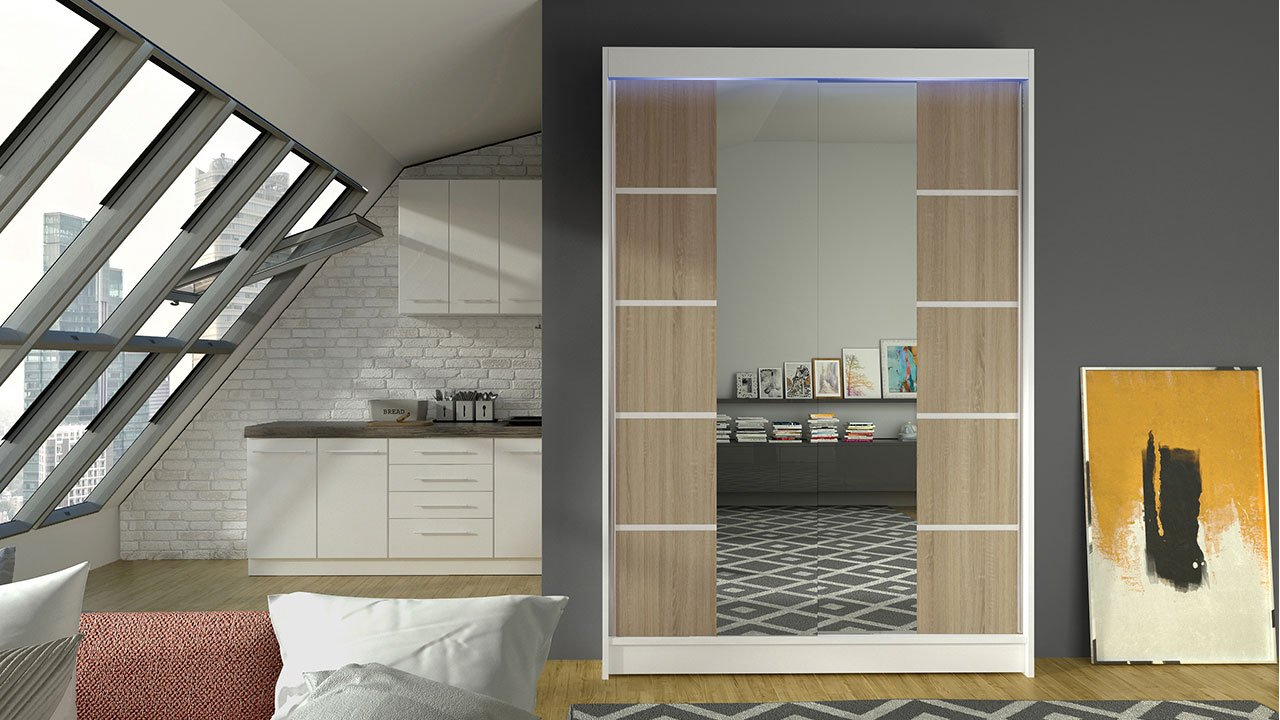 Z vizuálneho hľadiska je šatník k dispozícii v niekoľkých módnych farbách, pričom každá verzia je sprevádzaná zrkadlom namontovaným v strednej časti predných častí. Dekoratívnou hodnotou sú tiež symetrické pruhy zdobiace ľavú a pravú časť nábytku.