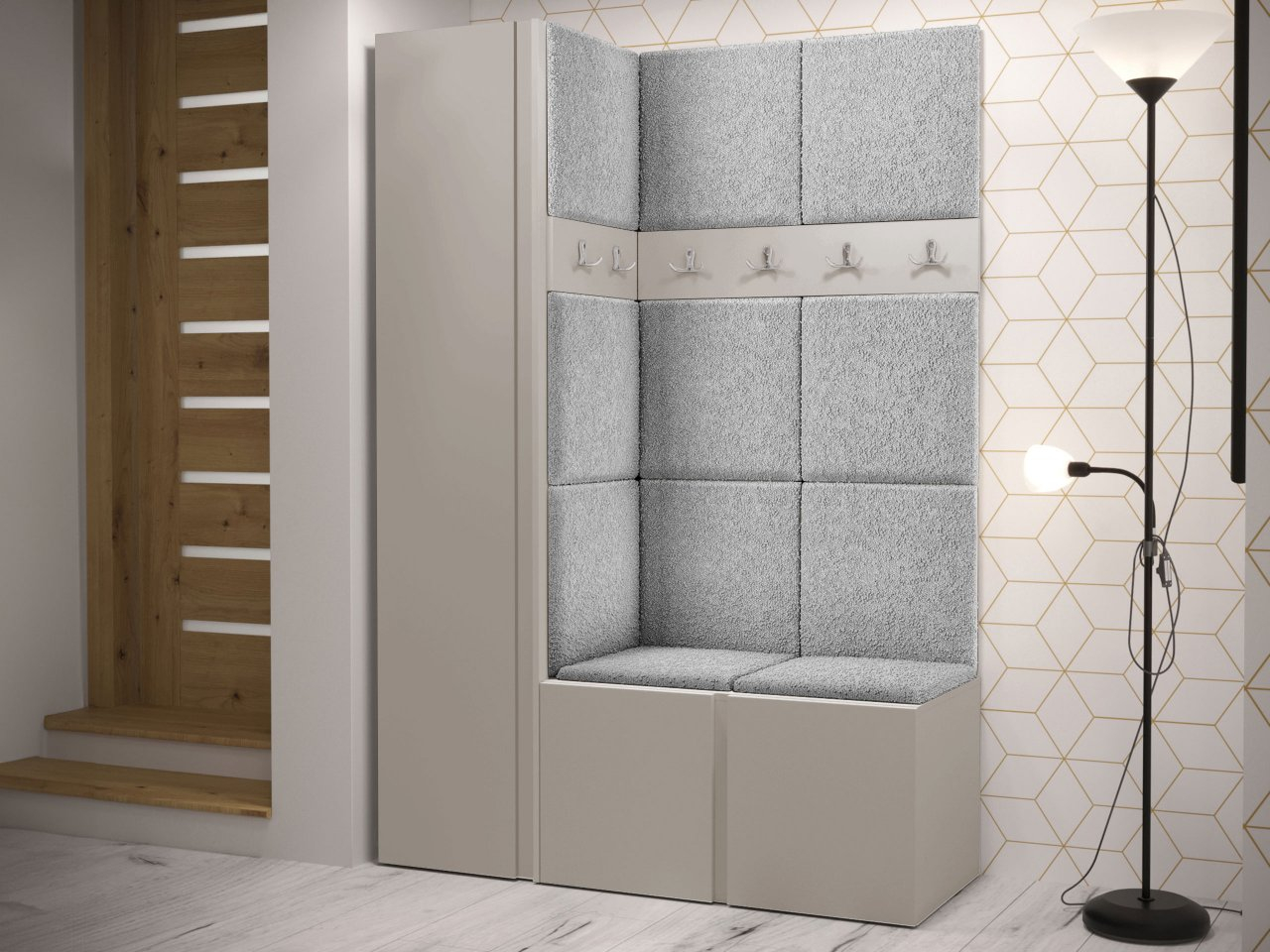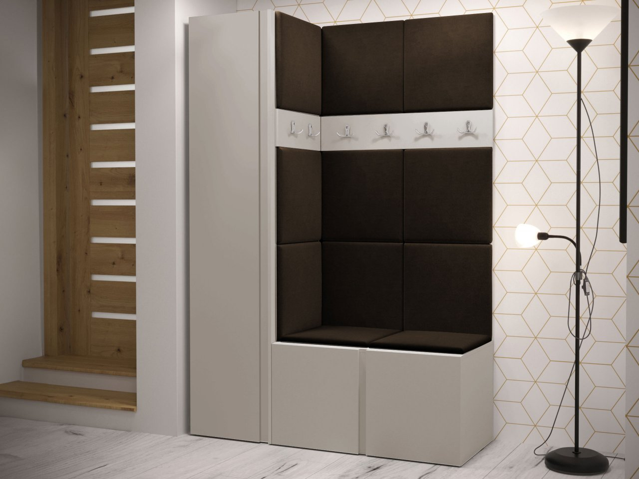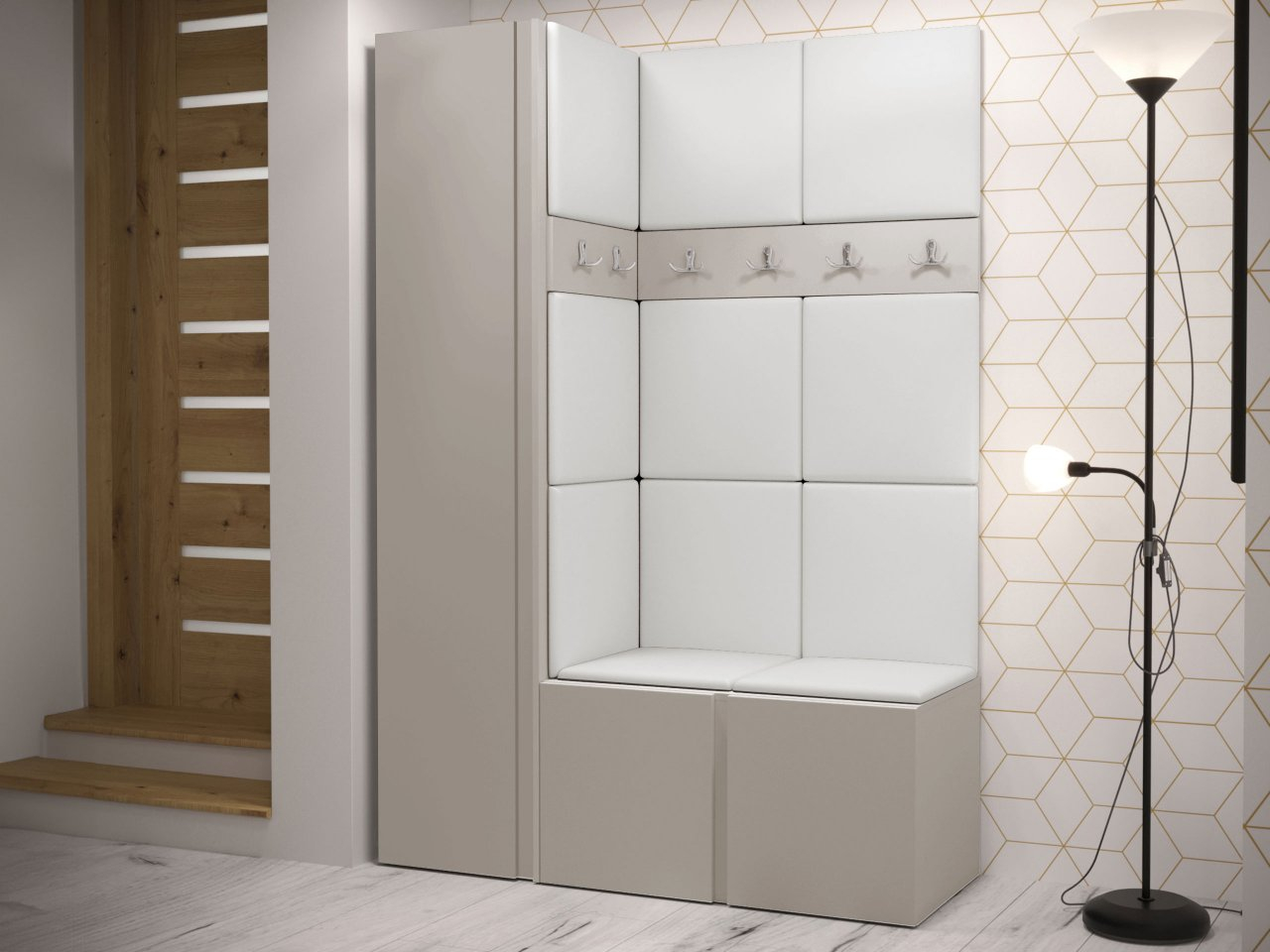 Predsieňový set obsahuje: šatníkovú skriňu, botník, dva vešiaky na šaty a čalúnený panel. Celá vec je veľmi funkčná, ale má aj dekoratívnu hodnotu. Vzhľadom na to, že ide o rohový model, bude perfektný do nerozvinutého kúta. Dostupné v mnohých farbách.