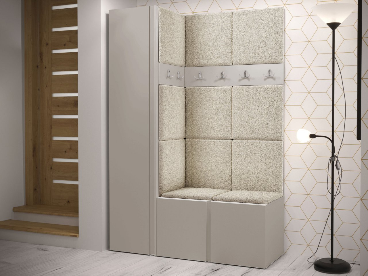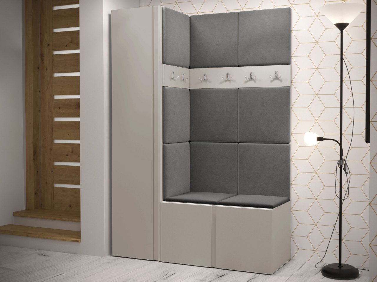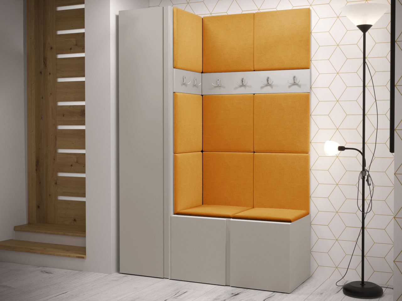 Predsieňový set obsahuje: šatníkovú skriňu, botník, dva vešiaky na šaty a čalúnený panel. Celá vec je veľmi funkčná, ale má aj dekoratívnu hodnotu. Vzhľadom na to, že ide o rohový model, bude perfektný do nerozvinutého kúta. Dostupné v mnohých farbách.