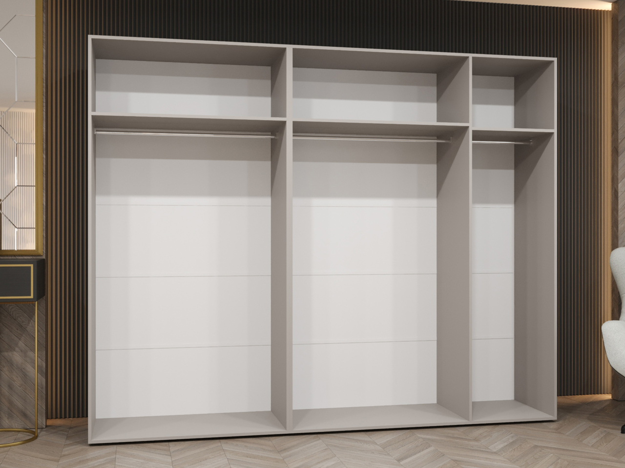Interiér šatníkovej skrine je navrhnutý tak, aby poskytoval maximálne pohodlie. Priestranné police, vešiaky na oblečenie a priestor na doplnky vám umožnia mať každý deň všetko upratané. Nie je to len miesto na odkladanie vecí, ale aj dekoratívny prvok, ktorý zdôrazňuje charakter interiéru a dodáva mu jedinečný vzhľad.