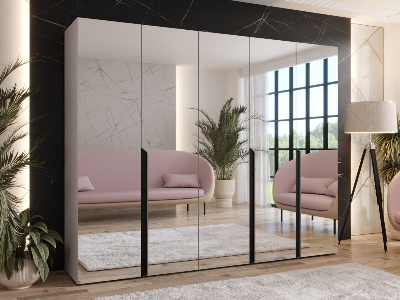 Moderná päťdverová šatníková skriňa Frokow 3 je dokonalým kompromisom medzi kapacitou a estetikou. Zrkadlá na prednej strane majú dekoratívnu aj praktickú funkciu. Mnohí ľudia oceňujú túto vlastnosť, pretože vďaka nej je v miestnosti viac svetla.