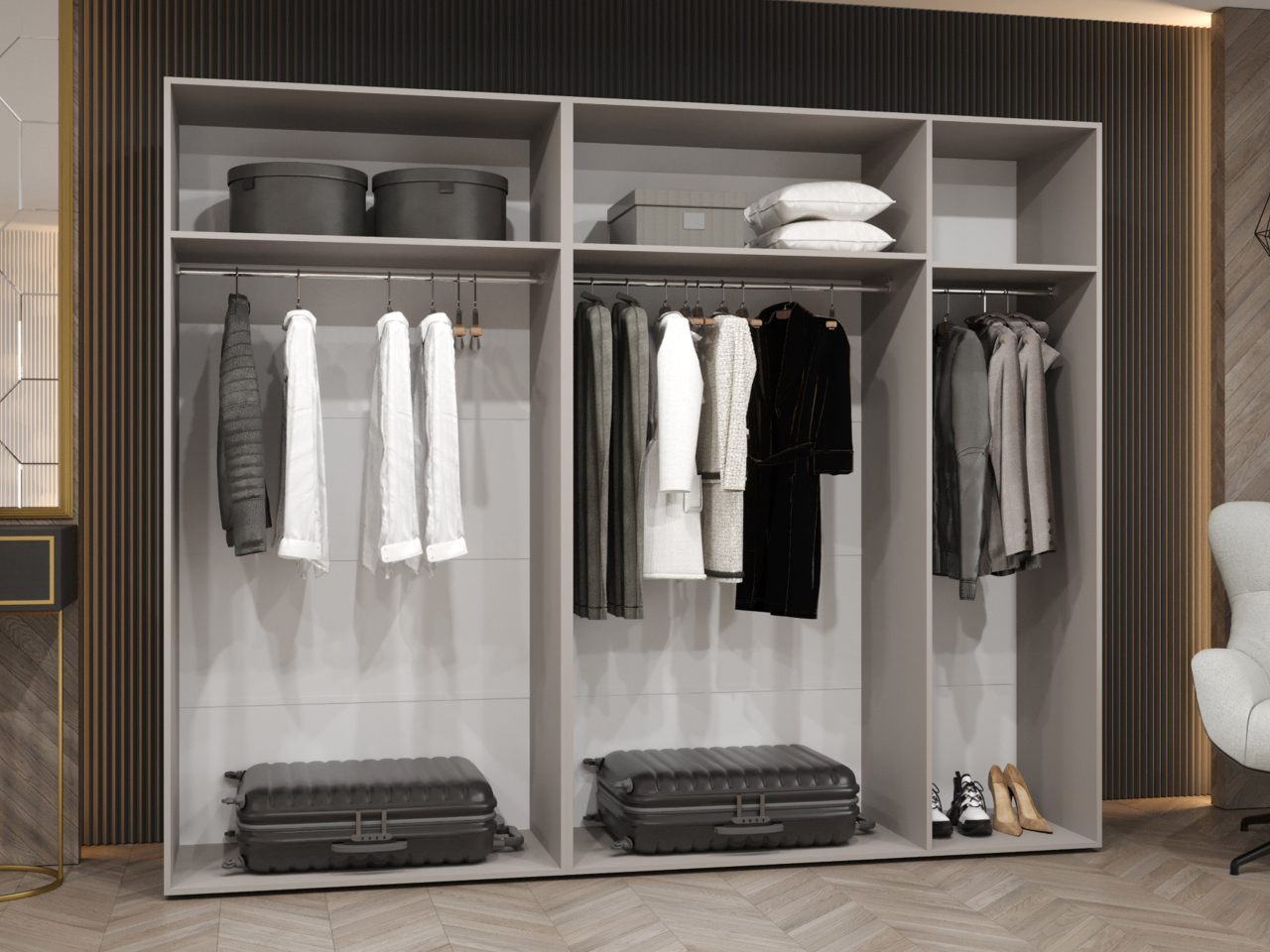 Premyslený interiér ponúka pohodlný úložný priestor na oblečenie, doplnky a textílie. Šatníková skriňa so zrkadlami je ideálna do spálne alebo väčšej predsiene, kde vám pomôže udržiavať poriadok každý deň. Striedme farby a štýlové detaily jej dodávajú univerzálny a nadčasový charakter.