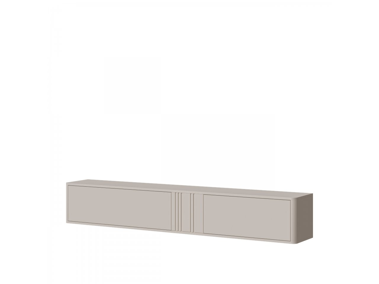 Tento nástenný TV stolík sa vyznačuje neutrálnou farebnou schémou, ktorá doplní takmer každý interiérový dizajn. Minimalistický dizajn je umocnený jemným dekoratívnym akcentom v strede. Široká vrchná časť umožňuje vystaviť rôzne dekoratívne predmety.