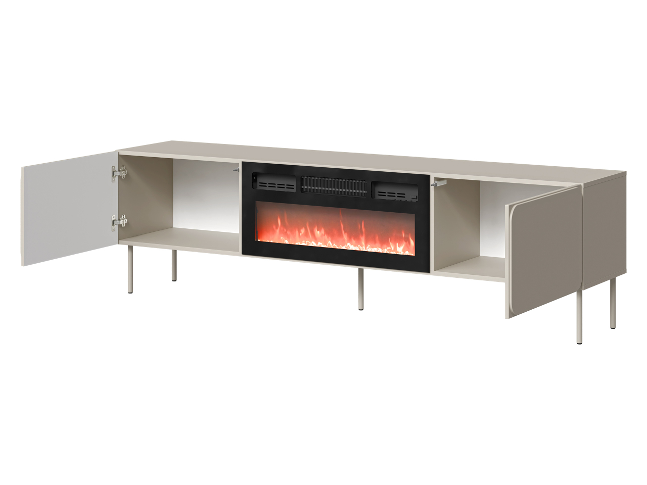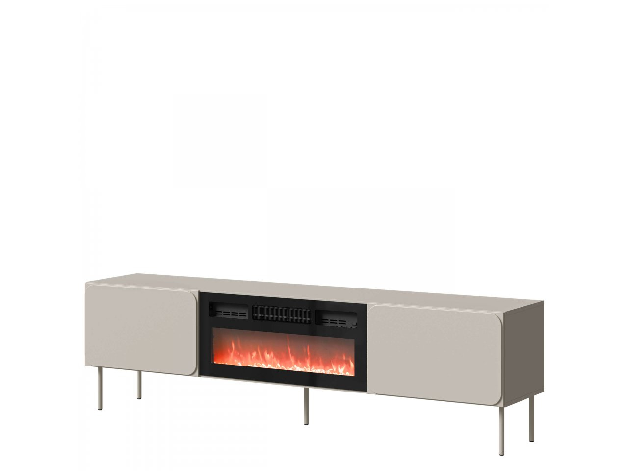 TV skrinka Tuxano s krbom vyniká svojou jednoduchou, elegantnou formou a tlmenými farbami, ktoré sa perfektne hodia do moderných interiérov. Hladké čelá bez úchytiek zdôrazňujú minimalistický charakter nábytku. Konštrukcia na štíhlych nohách dodáva celku vizuálnu ľahkosť.