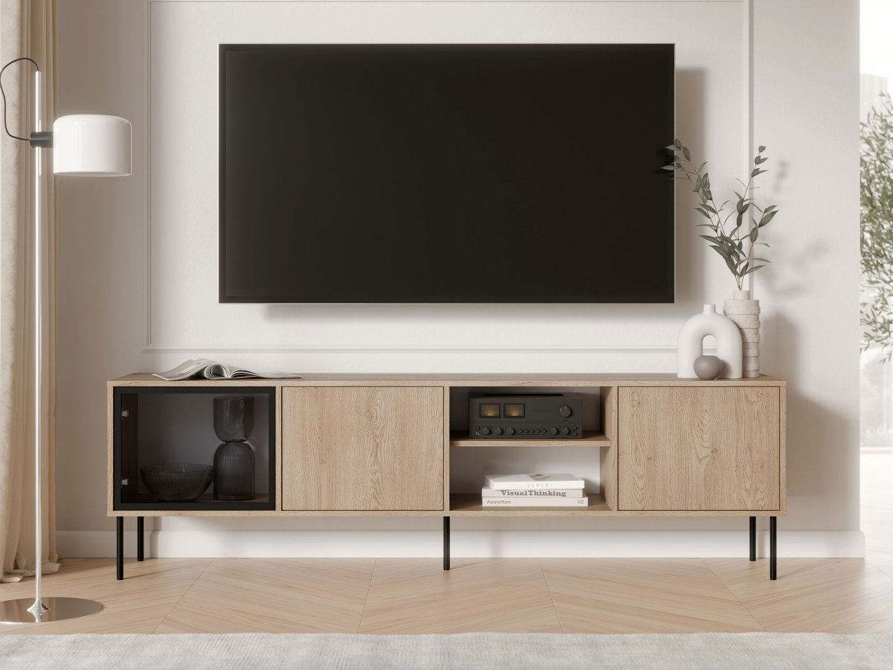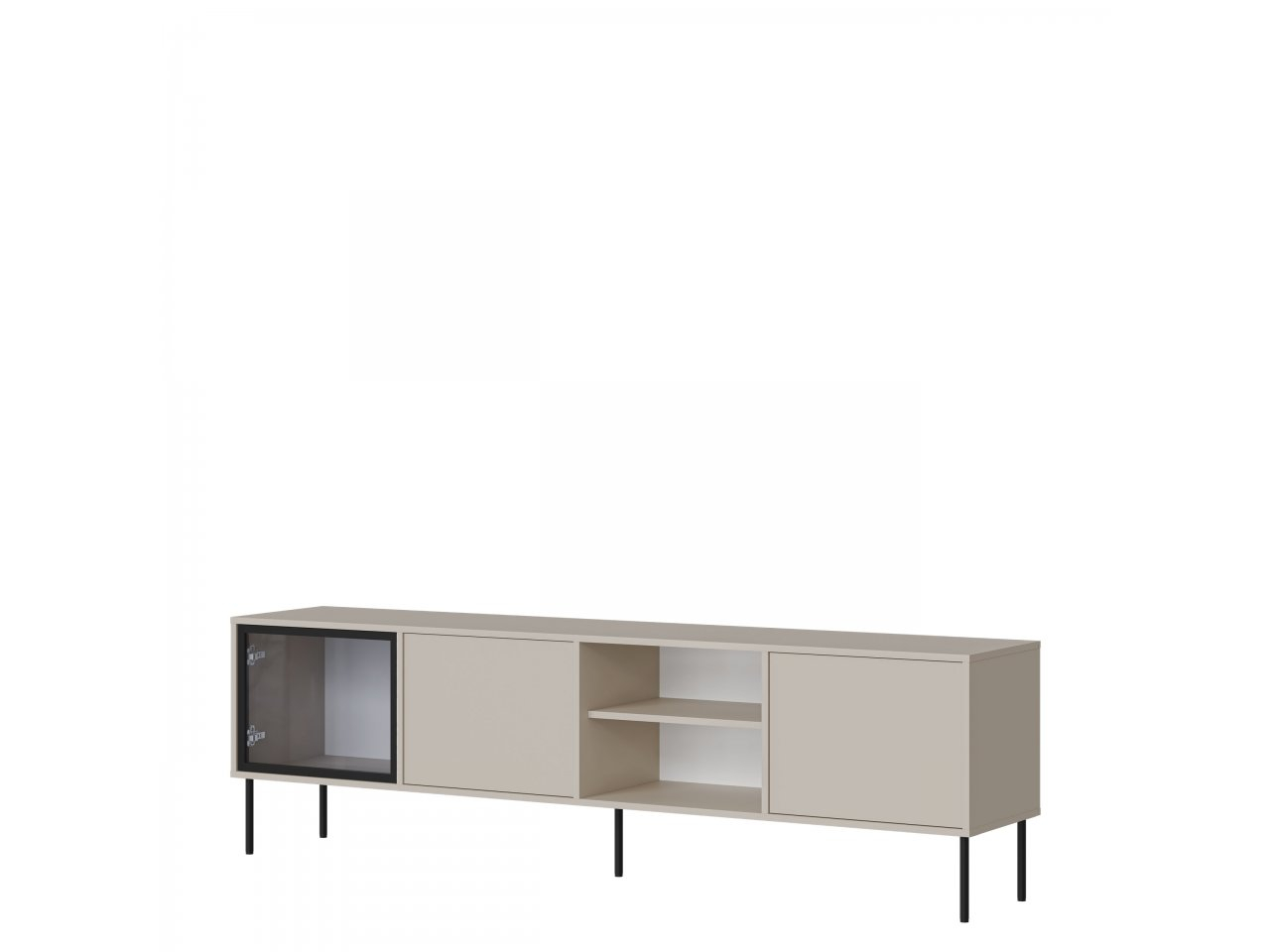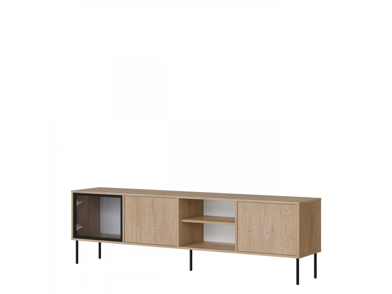 TV skrinka je namontovaná na štíhlych čiernych kovových nohách, ktoré jej dodávajú ľahký a moderný vzhľad a zároveň uľahčujú čistenie pod ňou. Ďalšou výhodou TV skrinky je jej premyslené usporiadanie, vďaka ktorému je ideálna na uloženie elektronických zariadení, príslušenstva a dekorácií, čím vytvára ucelenú a upratanú multimediálnu zónu v obývacej izbe.