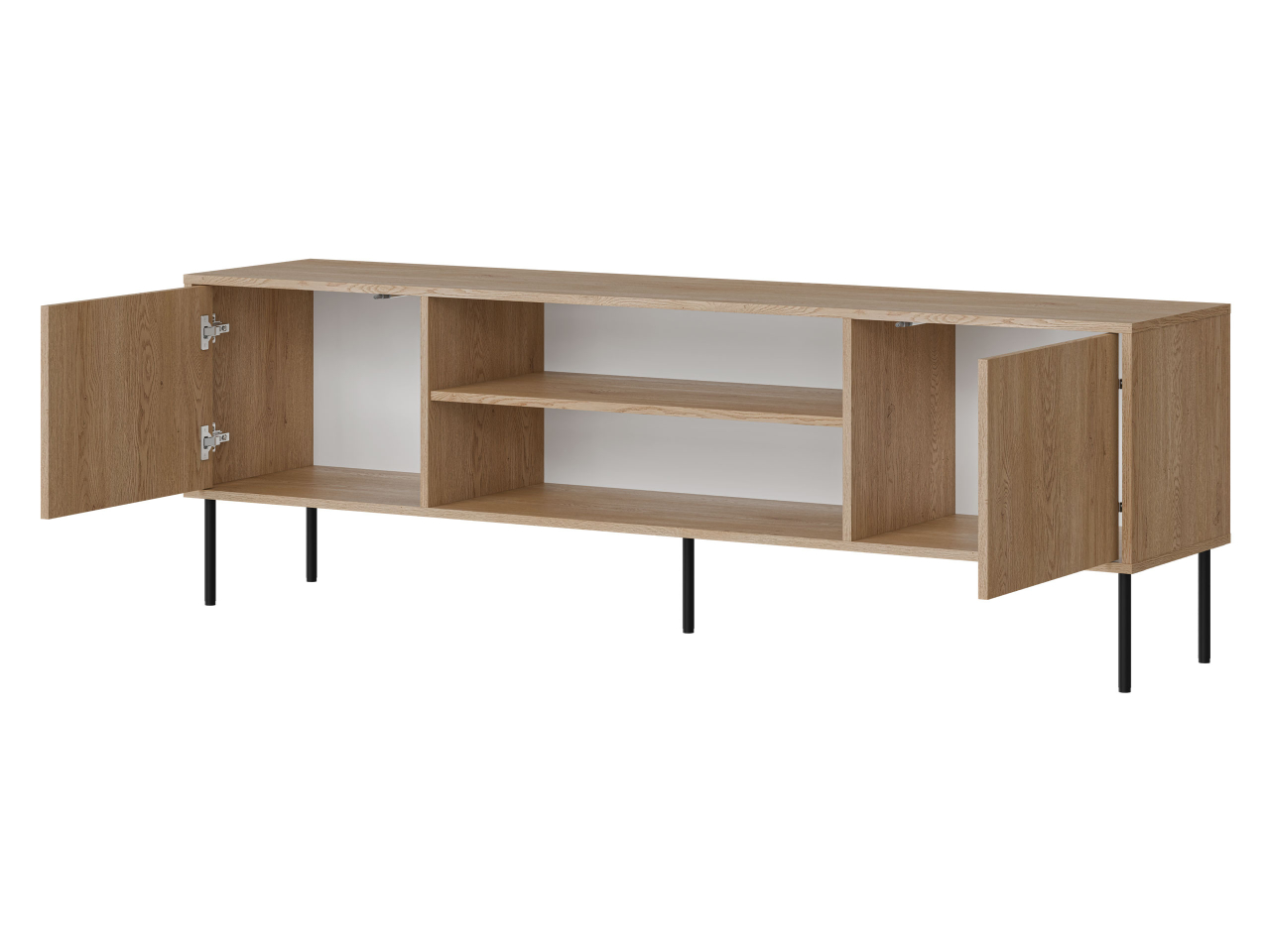Skrinky bez úchytiek s otvorenými policami vytvárajú praktický úložný priestor. Vaše domáce kino tu nájde svoje ideálne miesto. Ďalšou výhodou TV skrinky sú jej vysoké nožičky, ktoré uľahčujú každodenné udržiavanie poriadku na podlahe.