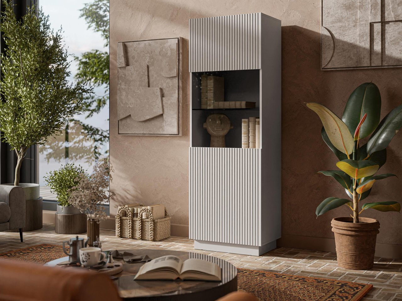 Štýlovým doplnkom v obývačke je vitrína Ceroza 1D. Jej drážkované predné strany dodávajú nádych elegancie – jeden z obľúbených detailov posledných sezón. Ich jednoduchosť a elegancia dokonale dopĺňajú interiéry od moderných až po glamour, ako aj tie inšpirované nadčasovou klasikou.