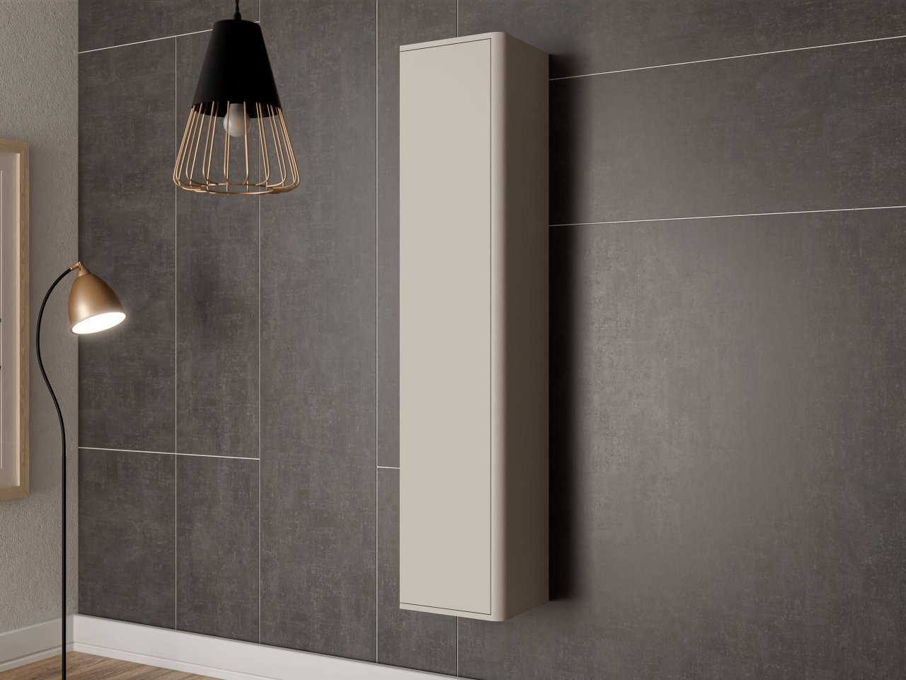 Uzavretá vitrína Zudbim je malý doplnok, ktorý slúži ako praktické riešenie na uloženie potrebných vecí. Jej interiér ponúka päť priestranných políc. Minimalistický dizajn vitríny vyzerá krásne v modernom obytnom priestore. Nábytok je zdobený zaoblenými hranami a hladkým predným dielom bez úchytiek. Nástenná vitrína Zudbim bola navrhnutá tak, aby spĺňala estetické aj praktické očakávania.
