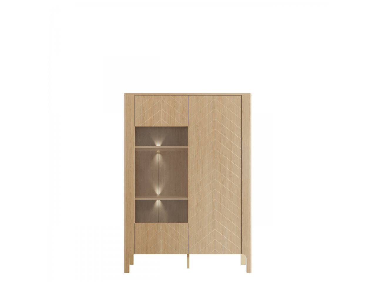 Táto módna vitrína so zaoblenými hranami ponúka dostatok úložného priestoru. Okrem presklenej vitríny má vitrína aj množstvo poličiek. Obsah skrytý za prednými stranami môže byť rôznorodý. Na priestranných policiach sa dá ľahko usporiadať riad, kufor s príbormi, obrusy alebo dokonca oblečenie.
