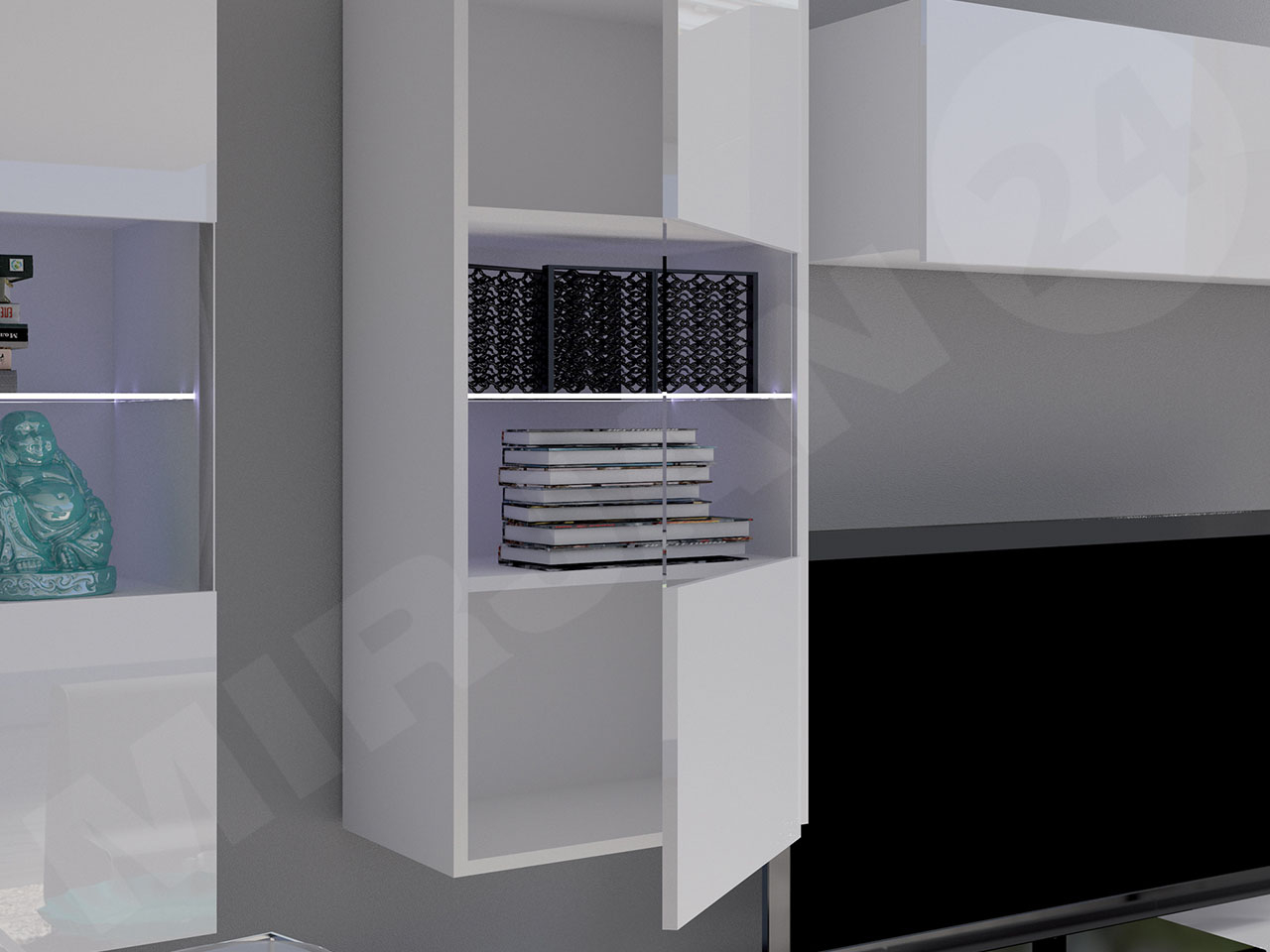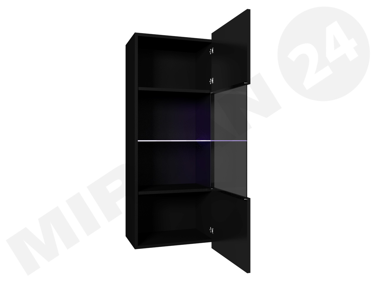 Neobvyklé predné časti vitríny, vyrobené v lesklom prevedení, opticky zväčšujú priestor aj vďaka hre svetla a tieňa, do ktorej sa zapája aj sklenená polica.