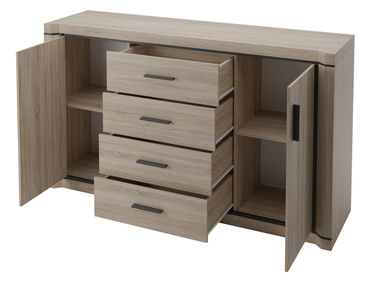 Komoda ponúka dostatok úložného priestoru v štyroch zásuvkách, ktoré sú umiestnené v centrálnej časti a dvoch skrinkách umiestnených po stranách. Je vyrobená z vysoko kvalitných komponentov a je k dispozícii v zaujímavých farbách.