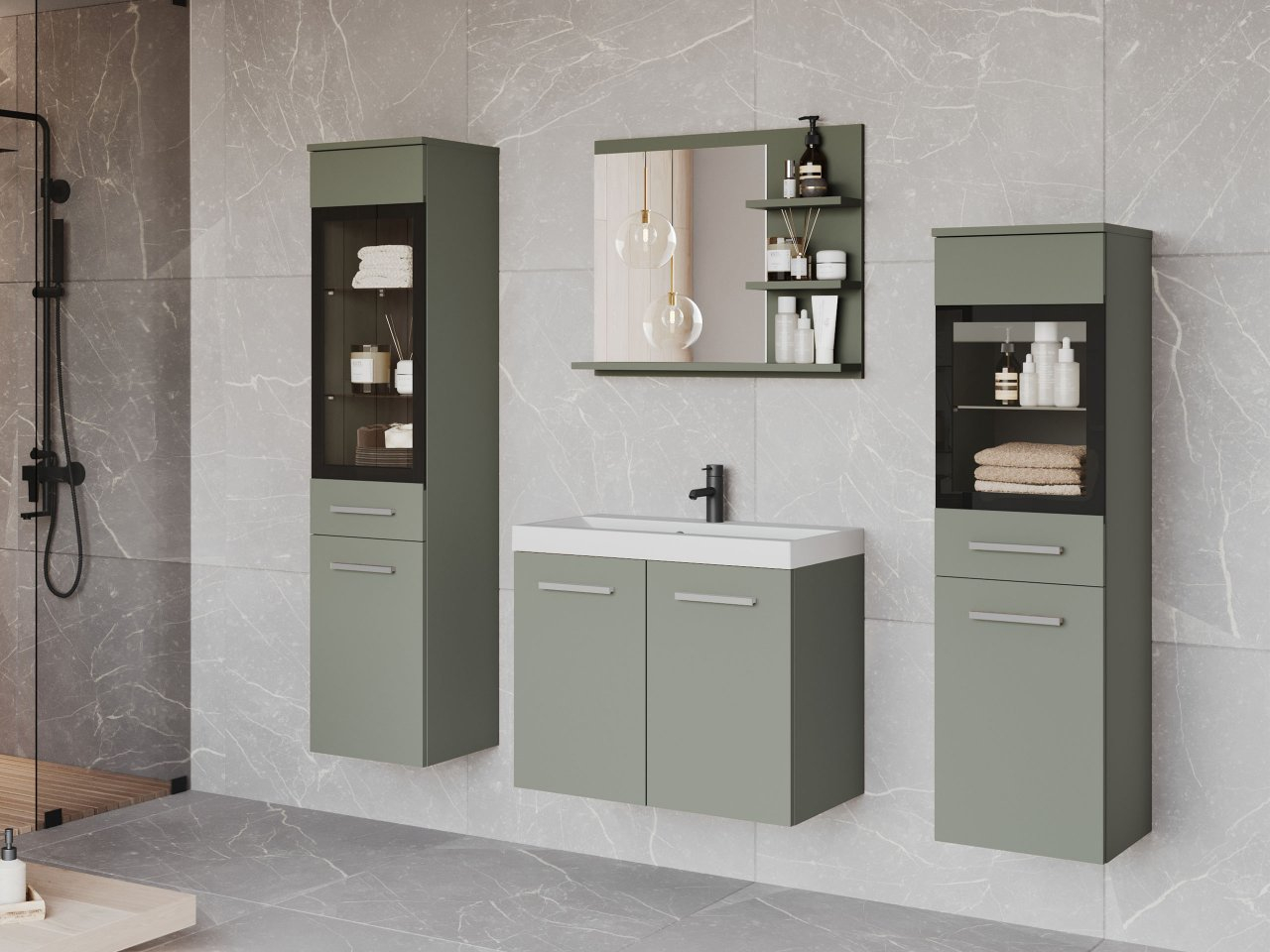 Zostava sa skladá z niekoľkých prvkov: troch závesných skriniek, panelu so zrkadlom a umývadla. Praktické police budú nielen miestom na odkladanie uterákov, kozmetických prostriedkov či čistiacich prostriedkov, ale aj miestom pre dekorácie. Za sklom sa budú skvele vynímať ozdobné lampičky, parfumy či iné drobnosti. Celok dopĺňajú šikovné madlá hliníkovej farby. Kúpeľňový nábytok je možné doplniť aj o LED osvetlenie, ktoré je k dispozícii za príplatok.